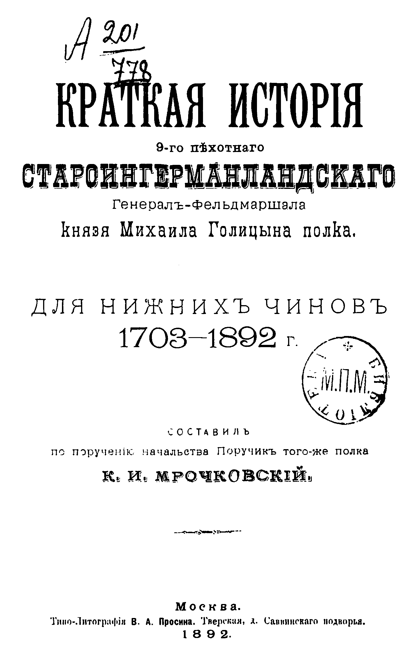 Краткая исторiя 9-го пѣхотнаго Староингерманландскаго Генерала-Фельдмаршала Князя Михаила Голицина полка. Для нижнихъ чиновъ 1703-1892 г.