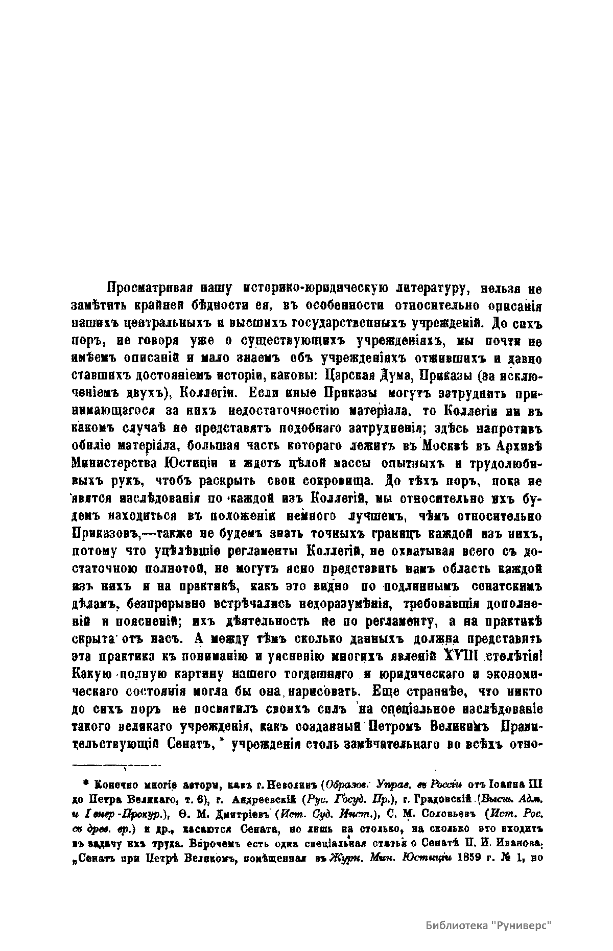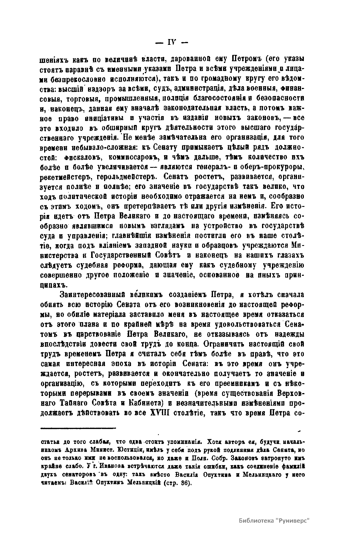 Сенат (1711 – 1917), высший государственный орган, подчиненный императору. Учрежден Петром Великим как высший орган по делам законодательства и государственного управления. С первой половины XIX века высший судебный орган, осуществлял надзор за деятельностью государственных учреждений и чиновников. По Судебным уставам 1864 г. высшая кассационная инстанция. Автор настоящего издания ограничивает свой труд временем Петра. Он считает, что это самая интересная эпоха в истории Сената: в это время он учреждается, растет, развивается и окончательно получает то значение и организацию, с которыми переходит к его преемникам. В книге говорится: о происхождении, развитии и значении Сената; составе Сената; круге ведомства Сената; о делопроизводстве Сената. В своей работе автор пользовался историческими и историко-юридическими сочинениями, а также Полным собранием законов и подлинными делами Сената.