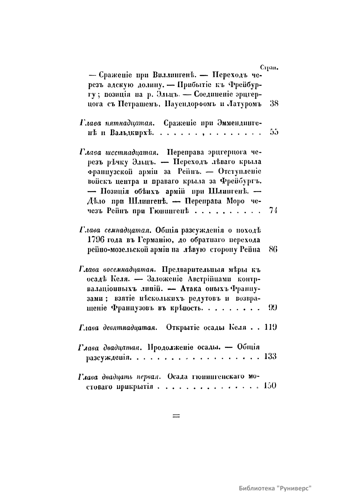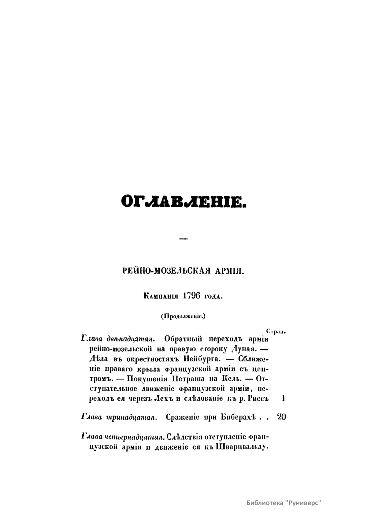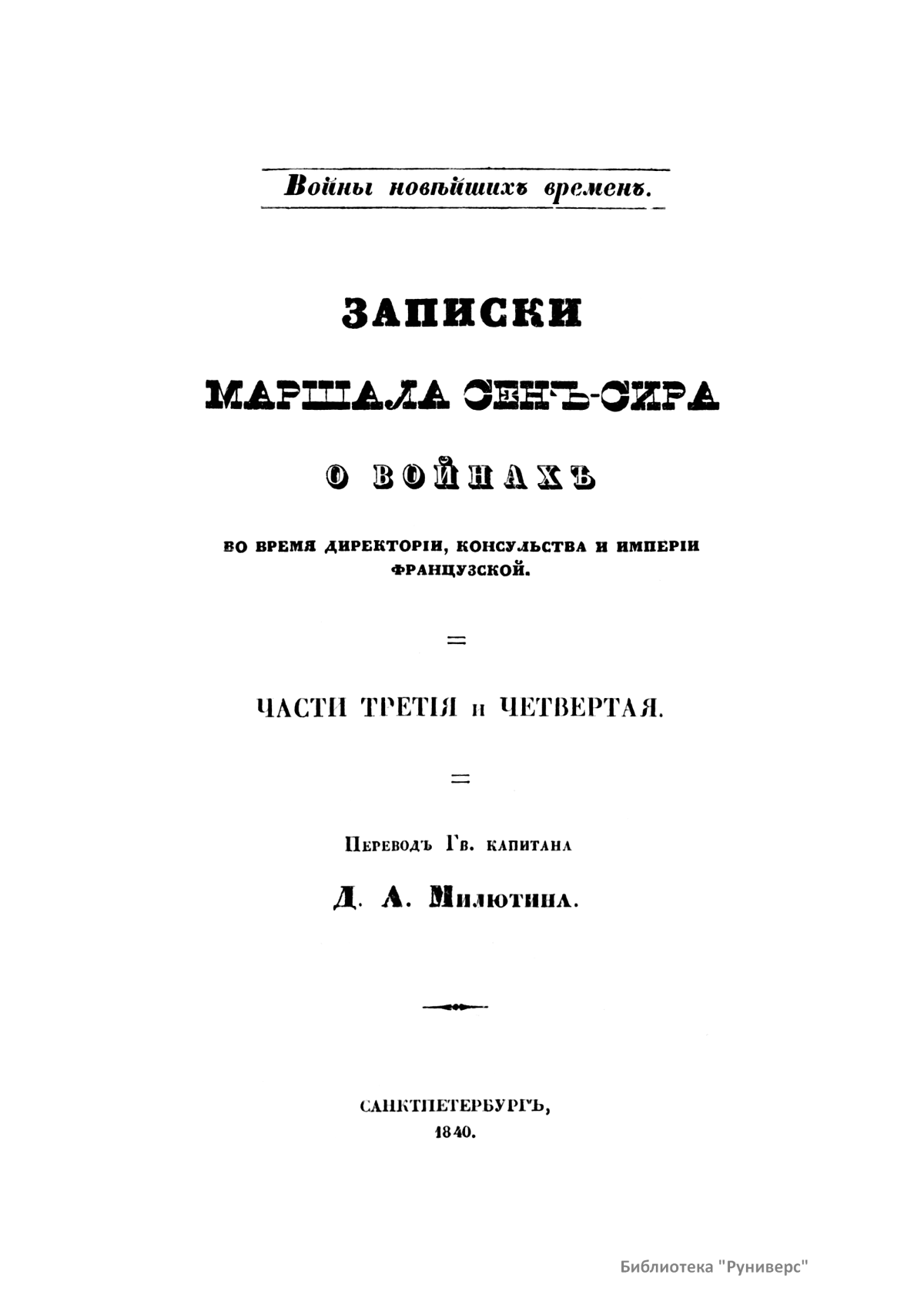 Первый том – Записки маршала Сен-Сира о войнах во времена директории, консульства и империи французской. Часть первая. Второй том – Сочинение Брандта. Обозрение истории военного искусства в средних веках. Третий том – История войн в Европе с 1792 г. вследствие перемены правления во Франции. Четвертый том – Сочинение Маккиавелли. Военное искусство. Пятый том – Записки маршала Сен-Сира о войнах во времена директории, консульства и империи французской. Части вторая и третья. Шестой том - Записки маршала Сен-Сира о войнах во времена директории, консульства и империи французской. Части третья (продолжение) и четвертая.