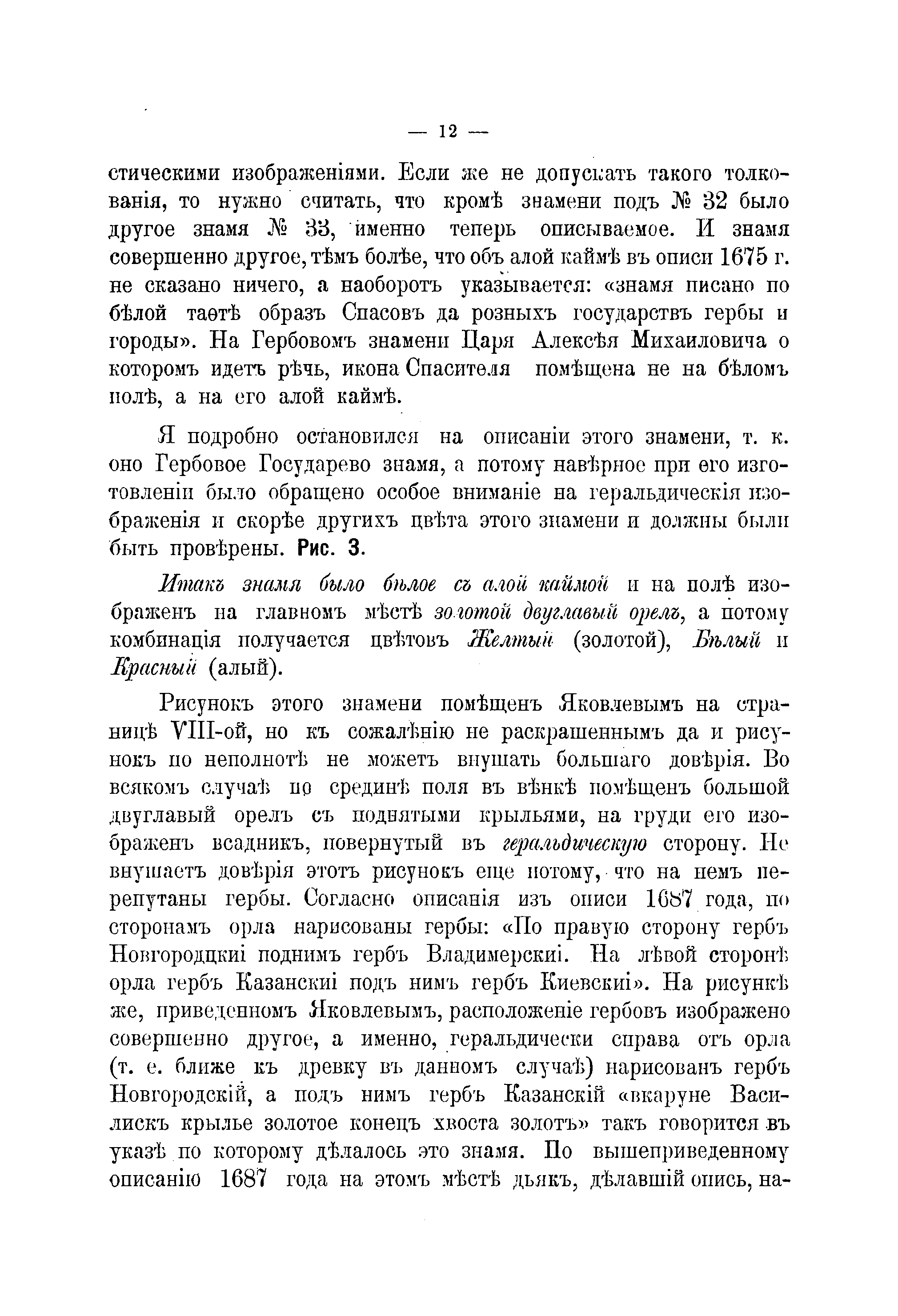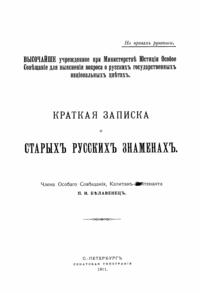 Краткий популярный очерк известного специалиста по военной и военно-морской истории России посвящен описанию знамён, начиная с хоругвей и стягов времён великого князя Дмитрия Донского (в XIV в.) до знамён, принятых в полках Российской императорской армии в эпоху Александра I. В брошюре приведено описание более 320 русских знамён различных периодов российской истории, особое внимание сосредоточено на знамёнах петровского времени. В правление последнего российского императора Николая II в придворных кругах широко обсуждалась проблема национальных цветов. Капитан-лейтенант Белавенец П.И, являясь членом Особого совещания при Министерстве юстиции для выяснения вопроса о русских государственных национальных цветах в 1910-1912 гг., весьма плодотворно занимался геральдикой, историей знамен и флагов. В ходе работы Совещания, и в печати велась острая полемика между сторонниками бело-сине-красного и черно-золото-белого флагов. Сторонниками первого был П.И. Белавенец, доставивший бело-сине-красное знамя Петра Великого, хранившееся в Архангельске и собравший сведения о русских знаменах, захваченных шведами под Нарвой, переиздавший и прокомментировавший книгу К. Алярда о флагах (Амстердам, 1695; Москва, 1709), а затем составивший специальную записку о русских знаменах. Результатом этой деятельности и стало данное издание.