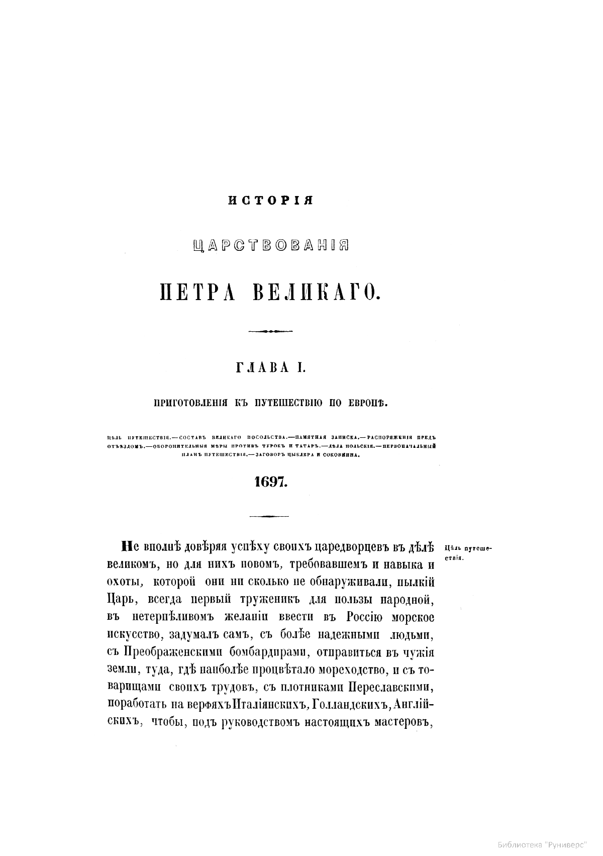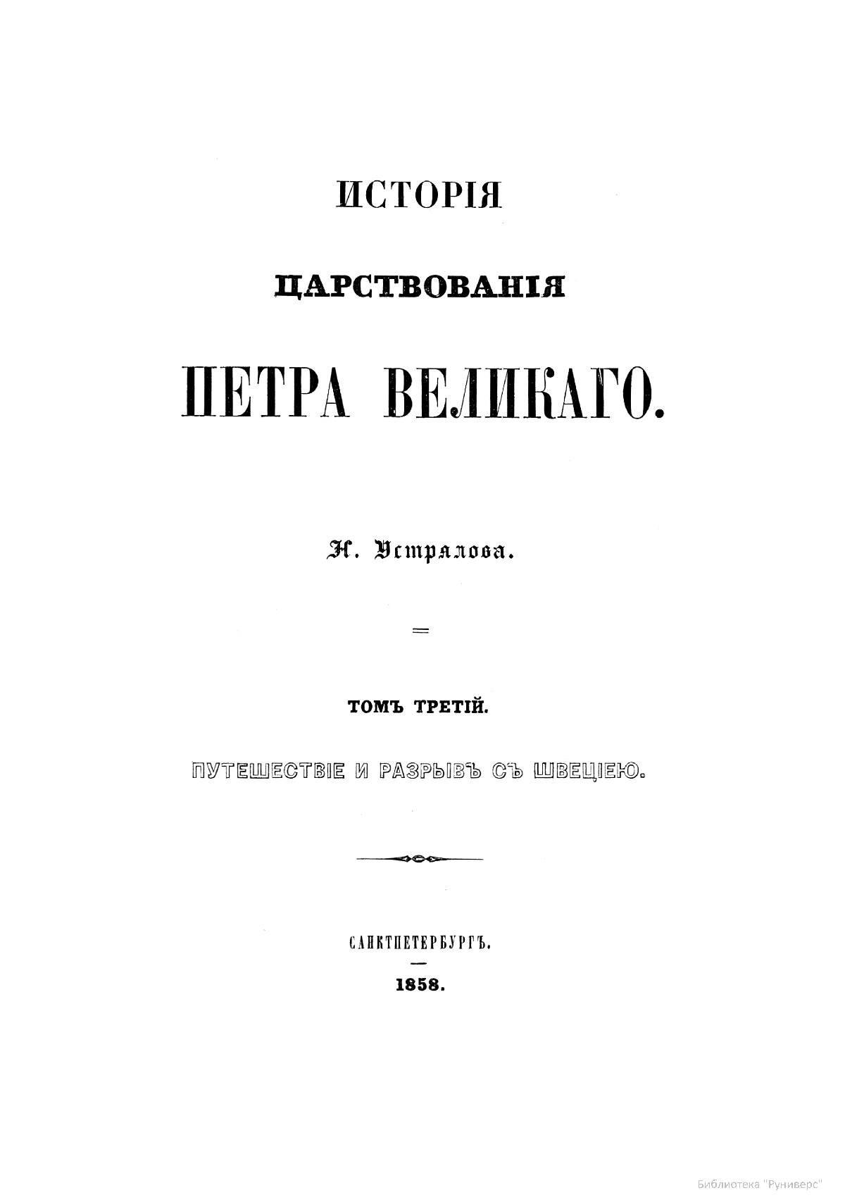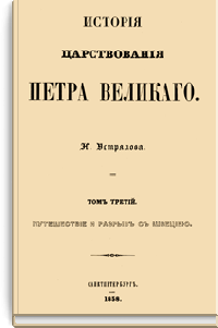 Устрялов Николай Герасимович (1805–1870) — профессор Петербургского университета, академик Императорской Академии наук. Самым важным трудом, которому Устрялов посвятил последние 23 года жизни, была «История царствования Петра Великого». Для ее создания автор использовал множество важных источников из государственного архива. Его труд остался незаконченным, но, несмотря на это, явился крупнейшим историческим исследованием.