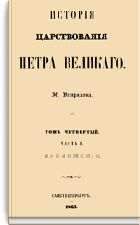 Устрялов Николай Герасимович (1805–1870) — профессор Петербургского университета, академик Императорской Академии наук. Самым важным трудом, которому Устрялов посвятил последние 23 года жизни, была «История царствования Петра Великого». Для ее создания автор использовал множество важных источников из государственного архива. Его труд остался незаконченным, но, несмотря на это, явился крупнейшим историческим исследованием.