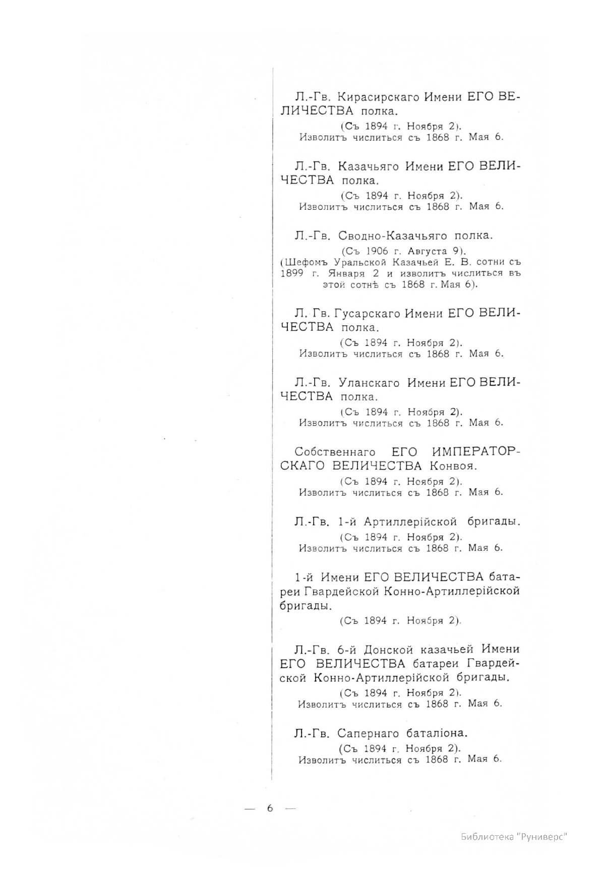 Краткие истории частей Императорской гвардии, наименования и переименования, командиры, шефы, боевой путь, награды гвардейских частей. Широко известные цветные таблицы униформы, составленные В. К. Шенком.