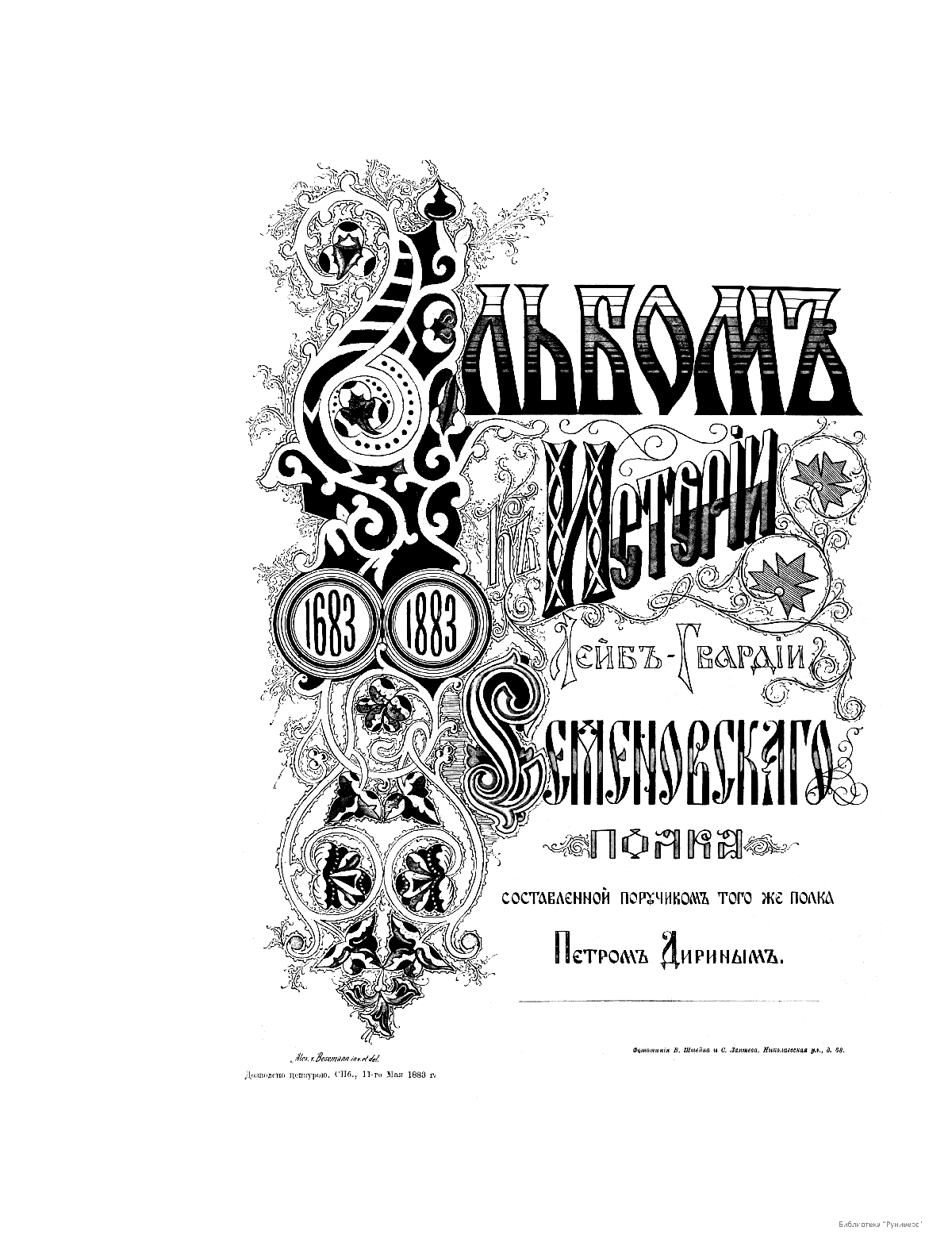 В 1883 г. в Санкт-Петербурге вышло в свет двухтомное издание, посвященное истории лейб-гвардии Семеновского полка, составленное поручиком Петром Дириным. Один из старейших полков российской армии — Семеновский — был сформирован в конце XVII века в подмосковном селе Семеновском из «потешных войск», созданных для забавы царевича Петра. В 1700 г. полк стал лейб-гвардейским, принимал участие во многих войнах, подавлении мятежей и дворцовых переворотах; в нем начинали военную службу генералиссимус А. В. Суворов-Рымникский, флотоводец А. Г. Орлов-Чесменский и фельдмаршал И. И. Дибич-Забалканский; его шефами были императоры и великие князья. Альбом иллюстраций состоит из двух листов текста и 38-ми отдельных листов монохромных изображений. На страницах альбома представлены портреты императоров, императриц, великих князей, командиров лейб-гвардии, рисунки форм обмундирования различных воинских чинов, а также иллюстрации крупнейших сражений Семеновского полка.
