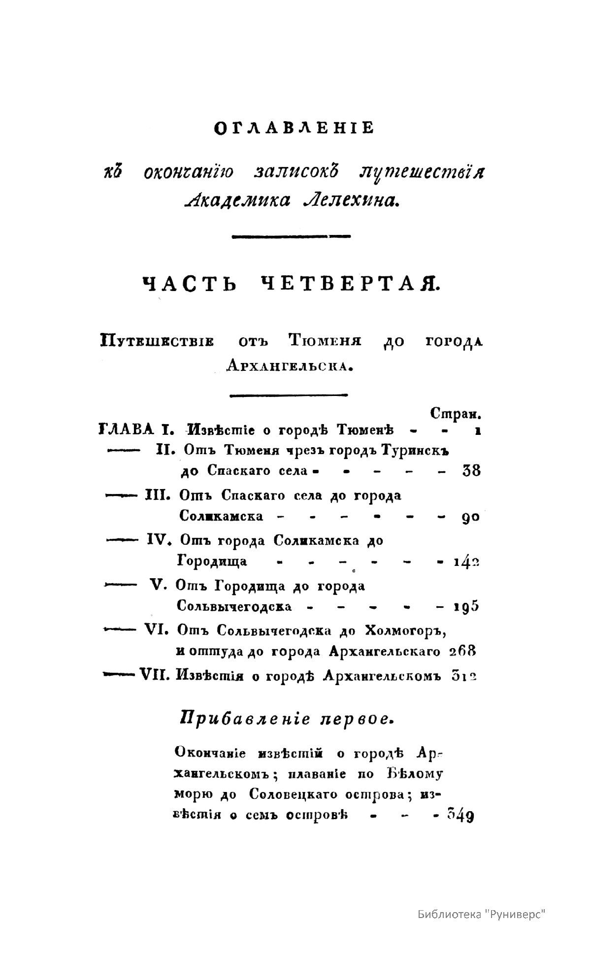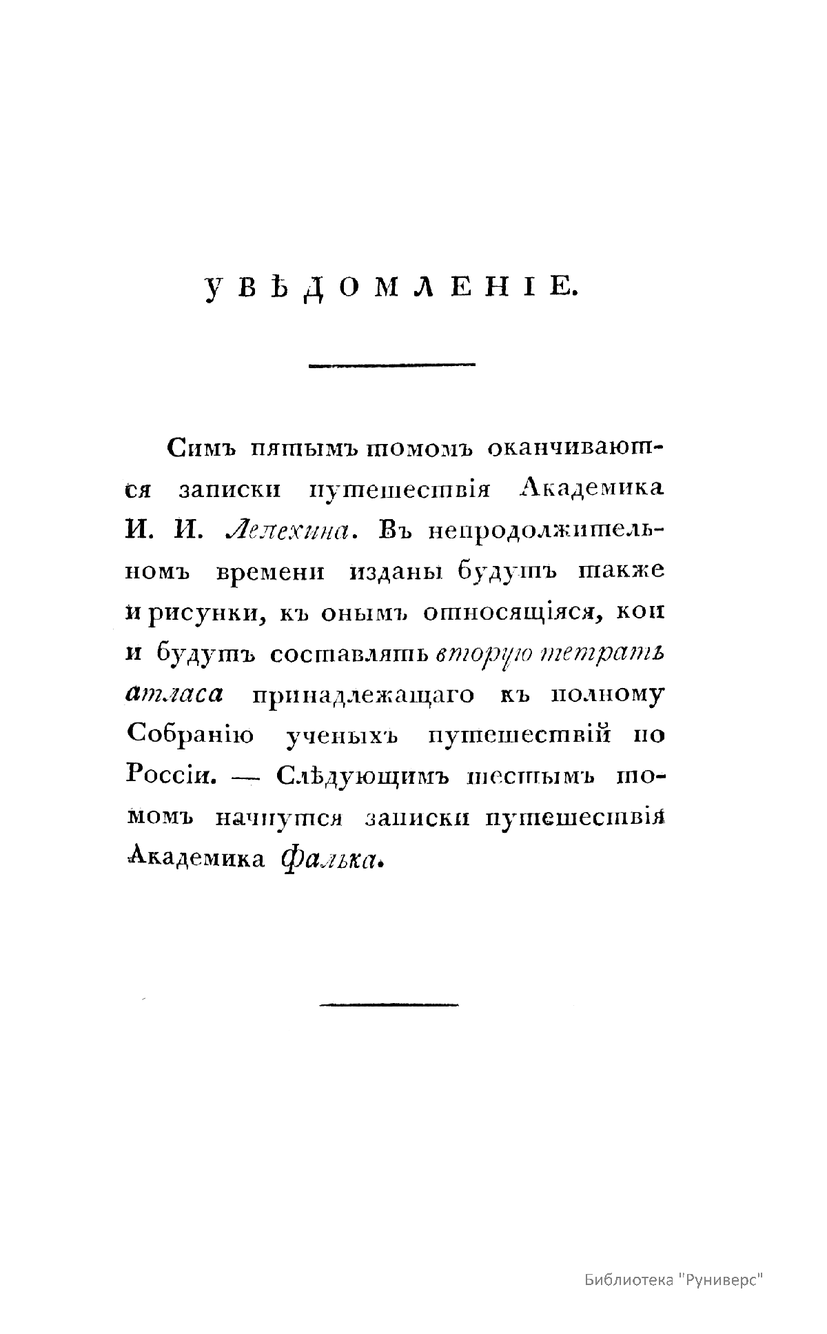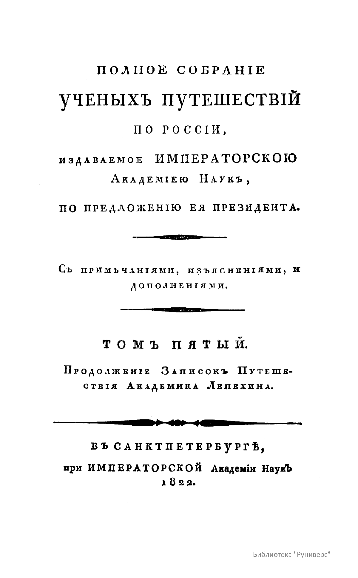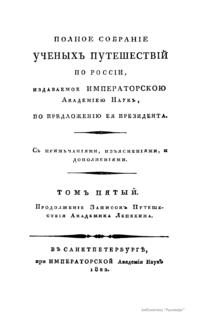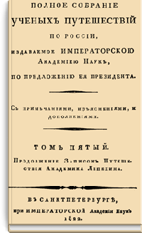 «Полное собрание ученых путешествий по России» вышло в свет по инициативе президента Санкт-Петербургской академии наук С. С. Уварова с целью обобщения и распространения основных сведений о России, полученных в результате экспедиций Академии наук, предпринятых в разные годы. В сочинение вошли следующие исследования: «Описание земли Камчатки» Степана Петровича Крашенинникова, ботаника и этнографа, участника Второй Камчатской экспедиции; «Записки путешествия академика Лепехина» (Иван Иванович Лепехин, естествоиспытатель и лексикограф, принимал участие во многих научных экспедициях по Уралу, Поволжью, Западной Сибири и Русскому Северу); «Записки путешествия академика Фалька» (Иоганн Петер Фальк, врач и естествоиспытатель, был начальником Оренбургской экспедиции, охватившей Сибирь и Алтай). Каждое исследование предваряет биография автора.
