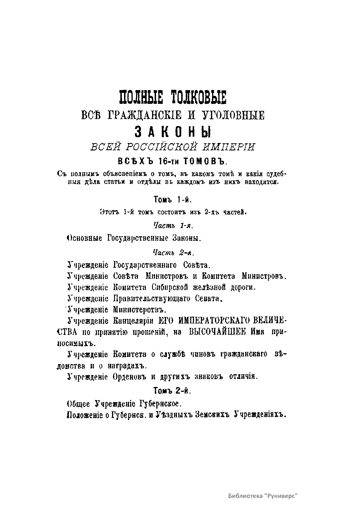 Полный толковникъ законовъ всѣх 16 томовъ или Россiйскiй судебникъ, который служитъ какъ руководство для всѣхъ истцовъ и отвѣтчиковъ, съ указанiемъ способовъ къ личной самозащитѣ, а также и къ начатiю всякихъ исковъ и преслѣдованiю по тяжебнымъ дѣламъ въ гражданскомъ и уголовномъ судѣ