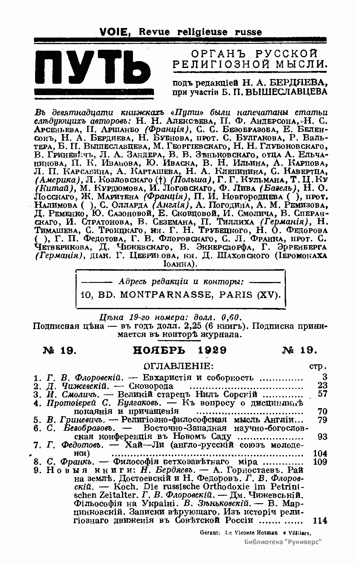 Путь: Орган русской религиозной мысли. №19. Ноябрь 1929