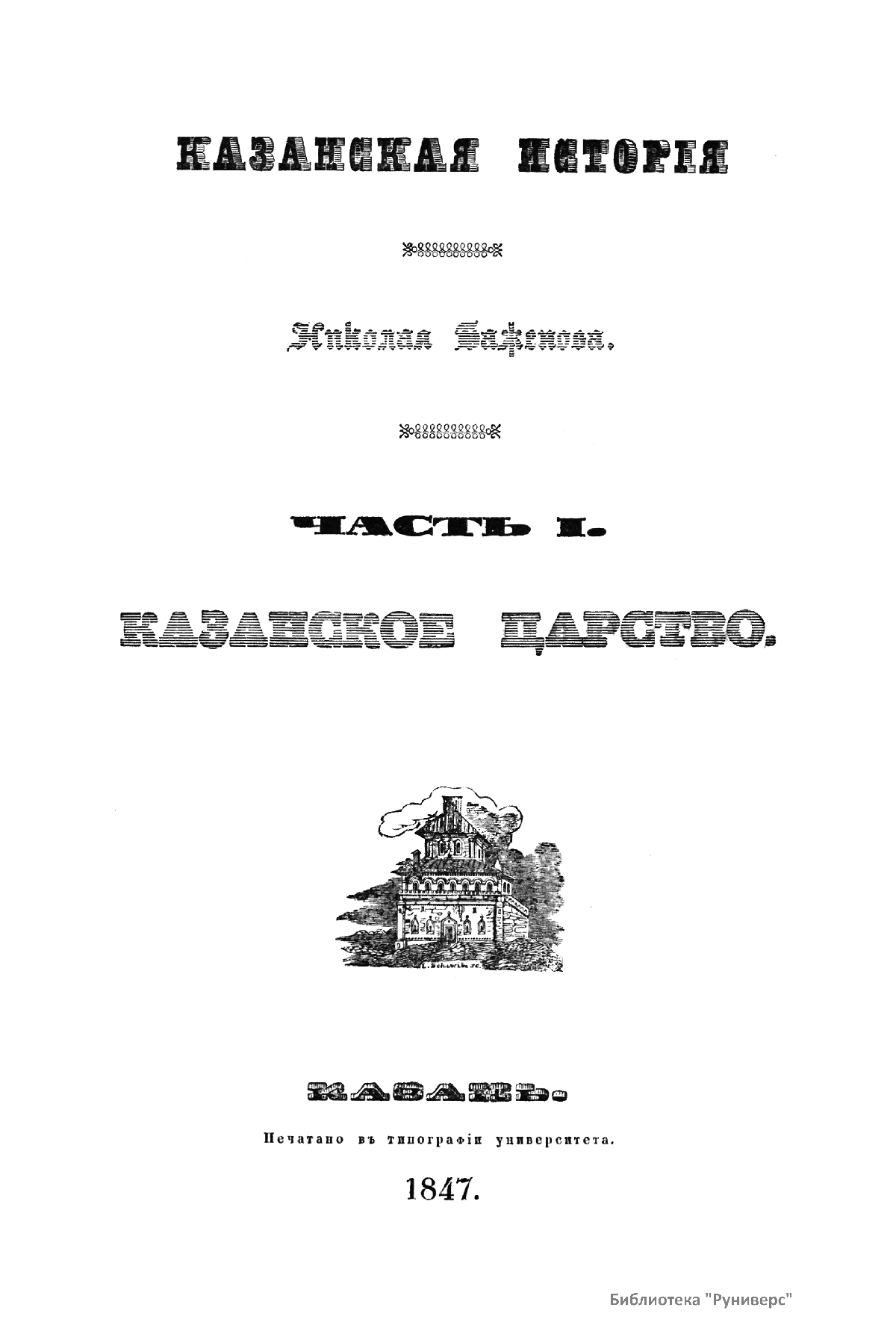 "Казанская история" Н. К. Баженова охватывает историю Казанского края от эпохи волжских булгар до 1847 года, издание до сих пор не утратило значение справочного при изучении местной истории. Книга состоит из трех частей. Часть первая описывает события от переселения болгар до покорения Казани, вторая — после покорения, третья часть — история современная, по 1847 год с топографическим и этнографическим описанием края.