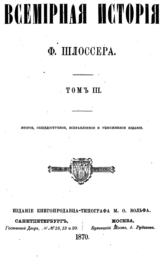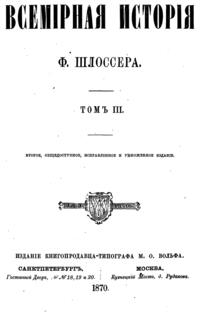 «Всемирная история» — знаменитый фундаментальный труд немецкого ученого Фридриха Кристофа Шлоссера представляет собой синтез его специальных исследований и университетских курсов. Описываемый период доведен до 1815 года.