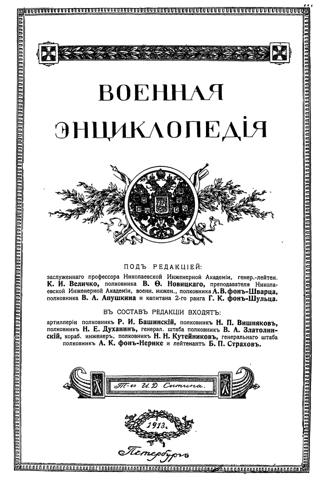 Благодаря издателю Ивану Дмитриевичу Сытину (1851-1934) энциклопедия по изяществу издания превосходила все подобные европейские издания того времени. В работе над энциклопедией принимали участие многие ведущие военные специалисты России, среди них особо выделяются генерал-майор А. Н. Апухтин, генерал-лейтенант М. М. Бородкин, генерал-майор И. И. Защук, капитан 2-го ранга П. И. Белавенец, полковник Н. М. Затворницкий, полковник П. Н. Краснов, генерал-лейтенанты А. П. Михневич, полковник А. Е. Снесарев, капитан В. К. Судравский и многие другие.