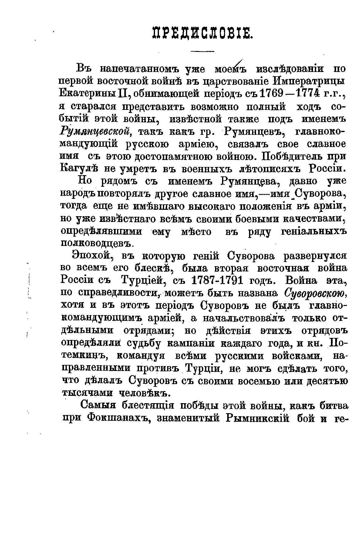 Вторая война екатерининского царствования была лишь продолжением первой. С такой точки зрения, Кучук — Кайнарджийский мир 1774 года был только перемирием. Выделив в качестве главного действующего лица войны 1769 — 1774 годов генерал-фельдмаршала Румянцева, в новом сочинении историк особенно отмечает победы полководца Суворова, даже называя в честь его имени сам конфликт «Суворовской войной». По мысли Петрова, несмотря на то, что Александр Васильевич командовал лишь войсковыми соединениями, нигде не имея полноты власти над всей армией, именно его действия на разных участках фронта предрешили исход всех кампаний затяжного противостояния. Сам главнокомандующий светлейший князь Потемкин, руководя всеми силами, не мог сделать того, что творил Суворов со своими восьмью или десятью тысячами человек.