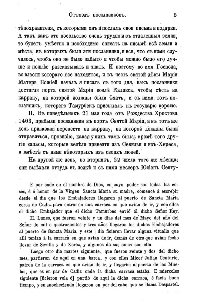 Сочинение Руи де Клавихо — своеобразный памятник испанской прозы: путевые заметки, написанные в форме дневника испанским послом, отправленным во главе ответного посольства в столицу Тимура Самарканд. Это произведение интересно не только как документ, в котором отмечаются глазами европейца факты и события начала XV в. на Востоке, но и как своего рода историческая энциклопедия. Труд Клавихо был создан примерно за полвека до начала испанского книгопечатания, а его издание было осуществлено только через полтора столетия, в пору наивысшего могущества Испании, когда уже были завоеваны Мексика, Перу, когда испанский конкистадор Васко Нуньес Бальбоа через панамский перешеек проник в Южную Америку, когда влияние Испании безраздельно господствовало в Европе. Издание сочинения Клавихо было призвано как бы иллюстрировать дальновидную политику испанских королей, еще в самом начале XV в. осуществивших захват Канарских островов (1402 г.), который стал прологом открытий в Новом Свете, и направлявших посольства на Восток — в Малую Азию и даже в Самарканд.