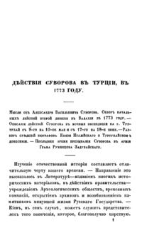 Автор пишет книгу, руководствуясь долгом «изучать отечественную историю… и иметь возможность знакомить своих соотечественников со славными событиями и великими мужами минувшей жизни России» Исследование опирается на материалы, найденные при разборе архива Военно-походной канцелярии графа Румянцева-Задунайского. Автор представляет в истинном виде и подробностях экспедицию А. В. Суворова на г. Туртукай, объясняет причины и цели действий полководца, а также их связь с общим ходом военных действий на нижнем и верхнем Дунае. Издание включает карту «План действий Суворова в первый поиск его на Туртукай».