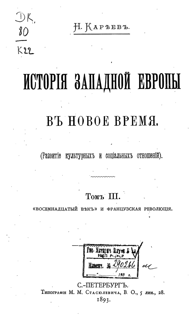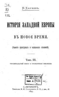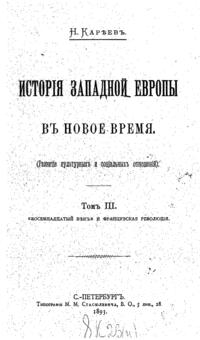 Первые тома вышли в начале девяностых годов 19 века и, посвященные- один «переходу от средних веков к новому времени», другой — «реформации и политической жизни в XVI и XVII вв.», третий — «XVIII веку и революции», — возникли из читанных им общих курсов новой истории, имевших своей целью выяснить значение двух главных переворотов в жизни европейского Запада за последние четыре века, т.е., реформации и революции — в связи с общим характером новой истории с её отличием от средневековой. Однако, позднее, Кареев решился раздвинуть границы первых задач и довести повествание до современнго ему положения дел.