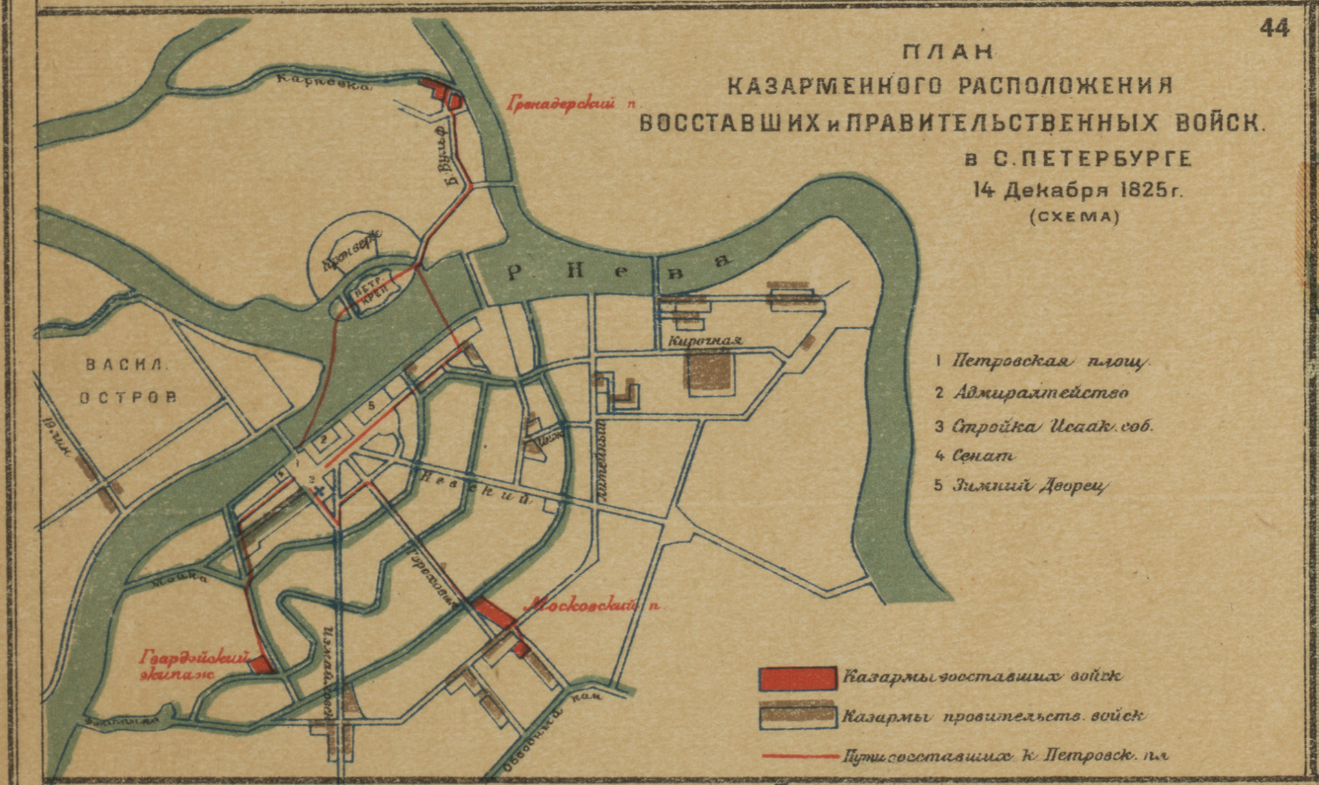План казарменного расположения восставших и правительственных войск в С. Петербурге 14 декабря 1825 года (схема)