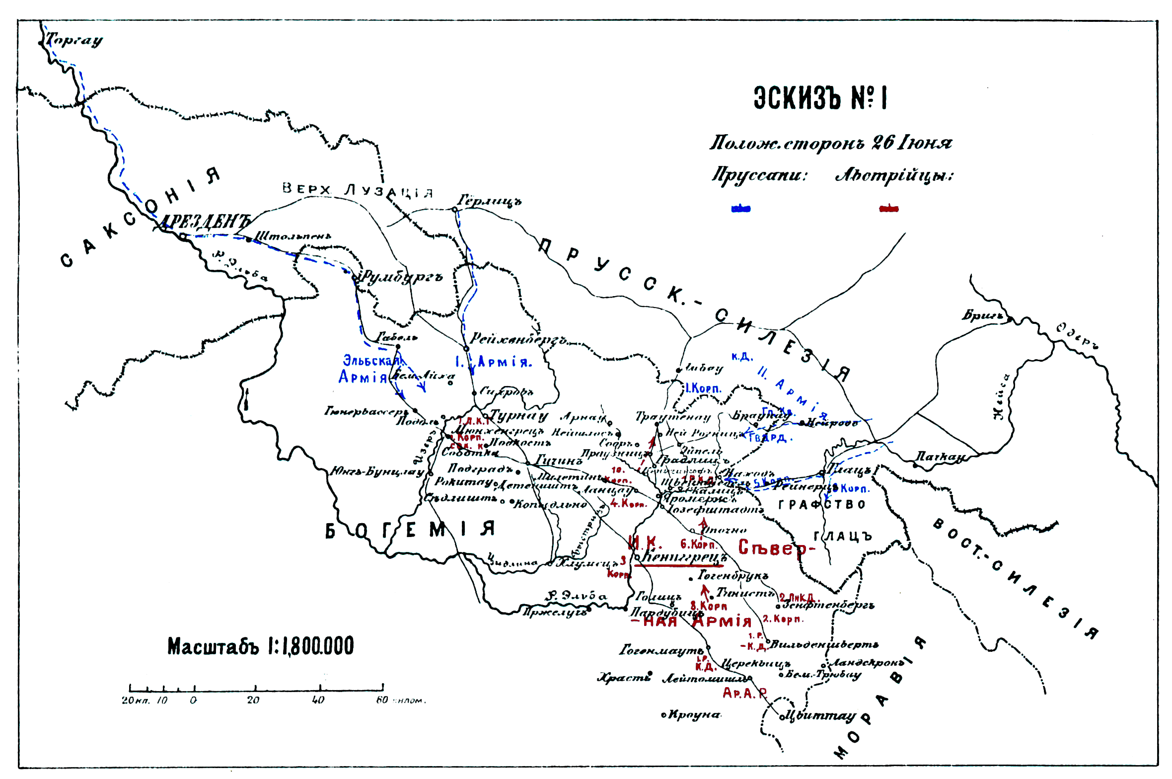 Сражение при Кениггреце 3 июля 1866 года. Эскиз №1. Положение сторон 26 июня