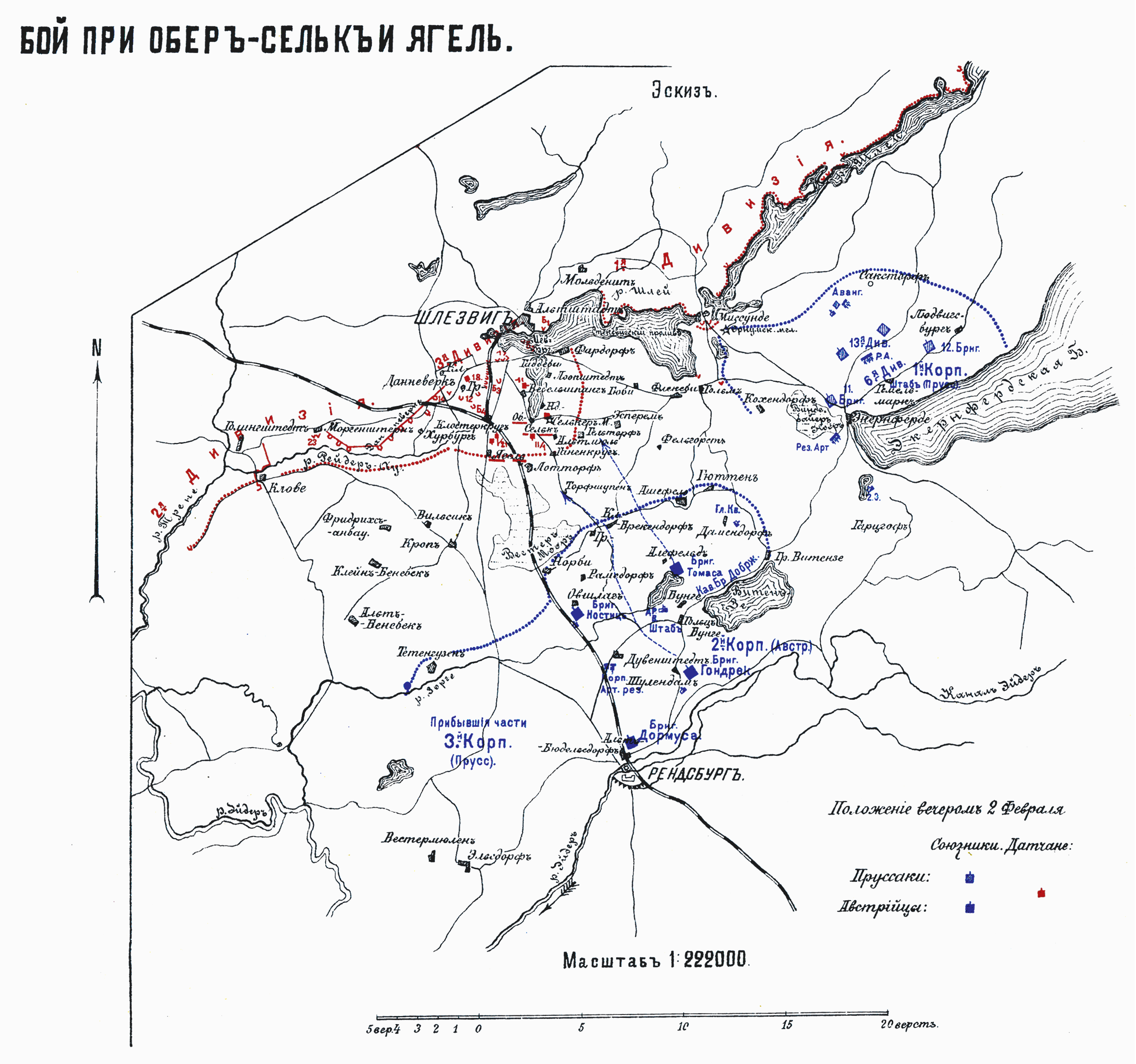 Бой при Обер-Сельк и Ягель. Эскиз. Положение вечером 2 февраля