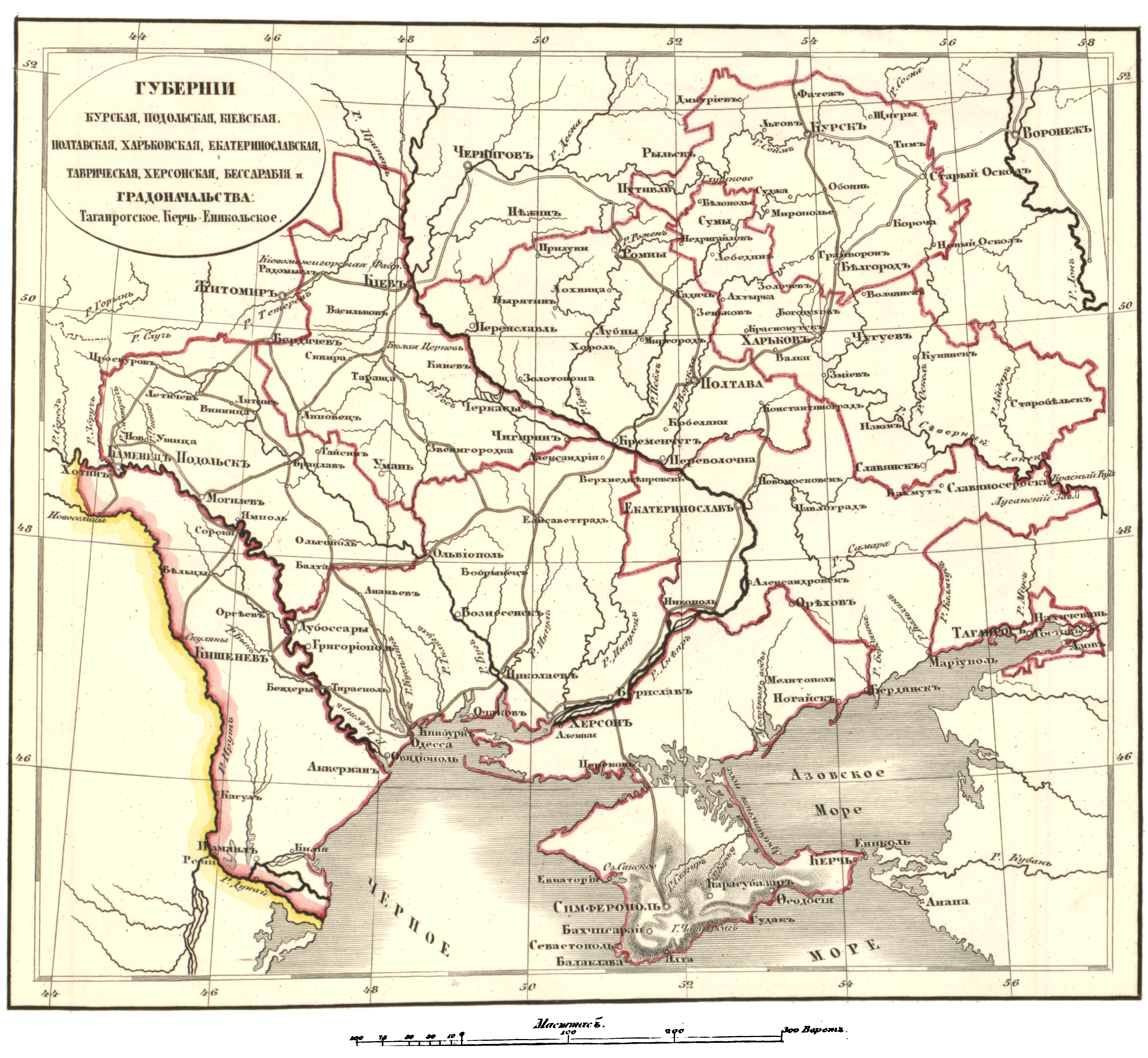 Губернии Курская, Подольская, Киевская, Полтаская, Харьковская, Екатеринославская, Таврическая, Херсонская, Бессарабия и Градоначальства: Таганрогское, Керчь-Еникольское