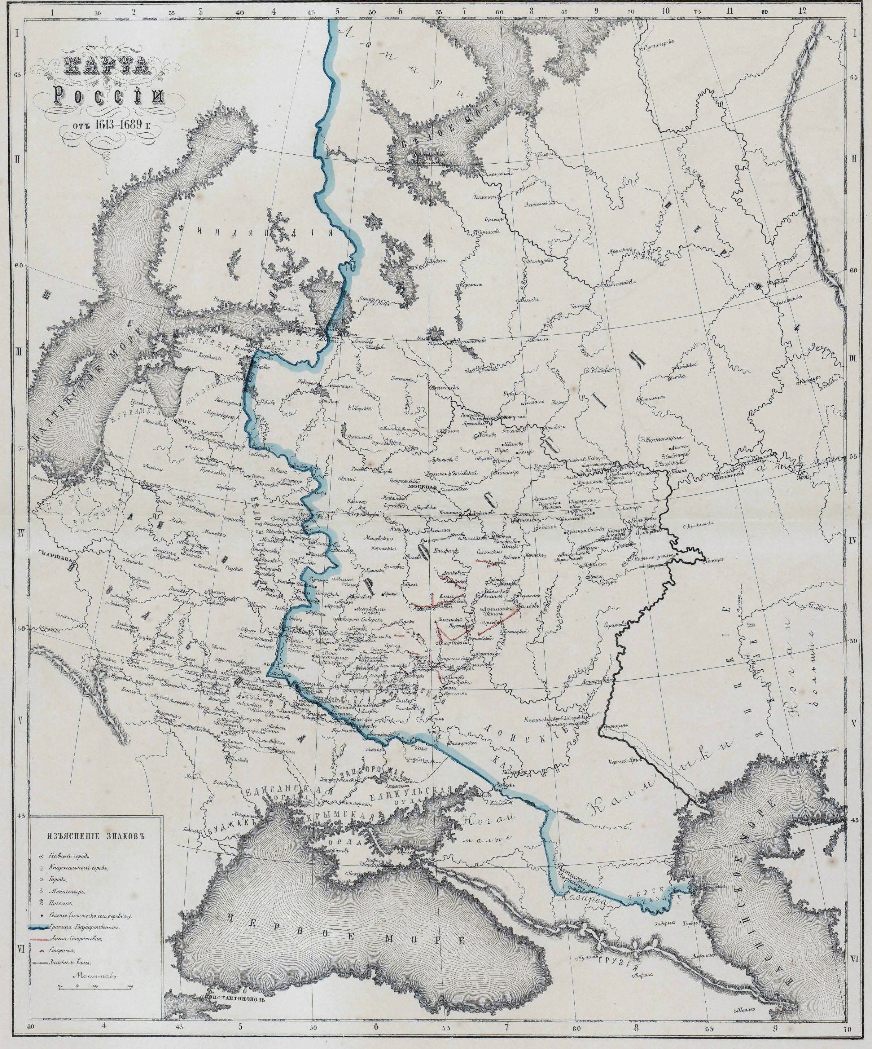 После Смутного времени Россия ещё долго не могла оправиться от разорения и в начале XVII века вынуждена была уступить соседним государствам несколько важных для неё областей. По Столбовскому договору 1617 года Ивангород, Ям, Копорье, Орешек и Кексгольм с прилегавшей областью отошли к Швеции и оставались за ней до XVIII века. Война со Швецией при Алексее Михайловиче, завершившаяся Кардисским договором 1661 года, не принесла России новых приобретений¹. Уступки были сделаны не только Швеции, но и Польше: по Деулинскому перемирию 1618 года (на 14 лет и 6 месяцев) к ней отошли города Смоленск, Белый, Дорогобуж, Рославль, Чернигов, Стародуб, Попова Гора, Новгород-Северский, Почеп, Трубчевск, Серпейск, Невель, Себеж, Красный и волость Велижская «с тем, что к той волости издавна тянуло»². «Вечный мир» с Польшей заключили на Поляновке в 1634 году; за ней закрепили города, отданные по Деулинскому перемирию, кроме Серпейска. Но «вечный мир» длился недолго. На Земском соборе 1 октября 1653 года решили принять Малороссию в подданство, что стало поводом к новым столкновениям с Польшей. Первая война с ней при Алексее Михайловиче была очень удачна для России: никогда ещё Москва не продвигала свои завоевания так далеко на запад. В 1655 году большая часть городов нынешних Смоленской, Витебской, Могилёвской, Минской, Ковенской и Гродненской губерний находилась во власти русских — Смоленск, Дорогобуж, Белый, Рославль, Почеп, Могилёв, Копысь, Трубчевск, Горы, Дубровна, Невель, Полоцк, Десна, Кричев, Озерище, Усвят, Сурож, Новый Быхов, Мстиславль, Орша, Шклов, Глубокое, Себеж, Витебск, Речица, Рогачёв, Вильно, Борисов, Велиж, Ковно и Гродно³. По Виленскому договору (24 октября 1656 г.) к Московскому государству предполагалось присоединить Белоруссию и Малороссию. На такие уступки Польша согласилась лишь временно и через несколько лет снова объявила России войну. Несмотря на понесённые потери, Андрусовское перемирие 1667 года закрепило за Россией важные приобретения: Смоленск, Дорогобуж, Красный, Невель, Себеж и Велиж (последние три были уступлены Польше в 1678 г.), Малороссию к востоку от Днепра и Киев с его правобережными пригородами, оставшийся за Россией, хотя формально его уступили лишь на два года. Только в 1686 году — то есть спустя 52 года после Поляновского договора — заключили «вечный мир» с Польшей и окончательно утвердили статьи Андрусовского перемирия⁴.