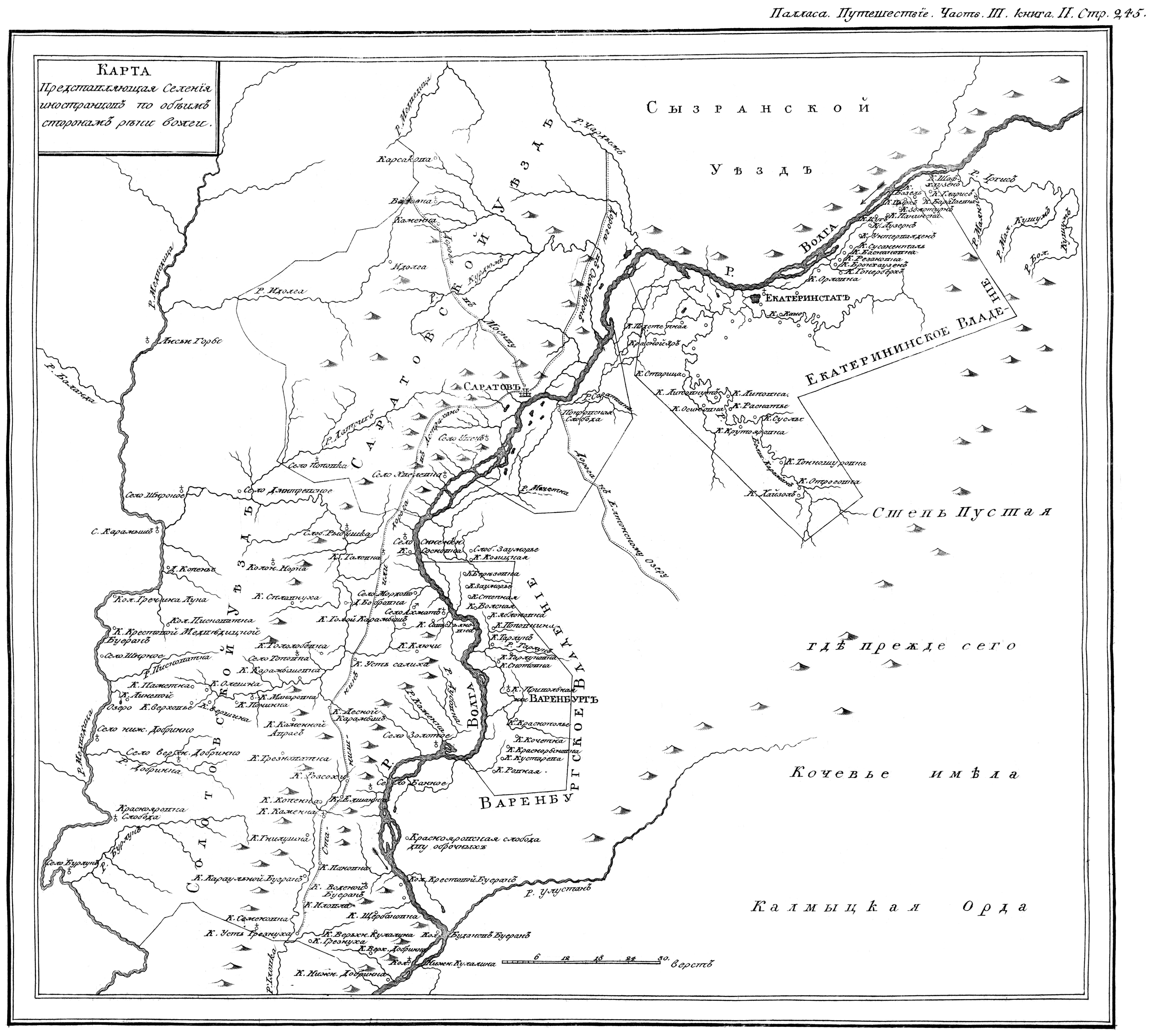 Карта представляющая селения иностранцев по обеим сторонам реки Волги.
