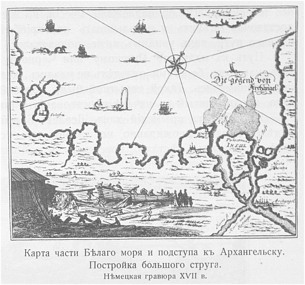 Карта части Белого моря и подступа к Архангельску. Постройка большого струга