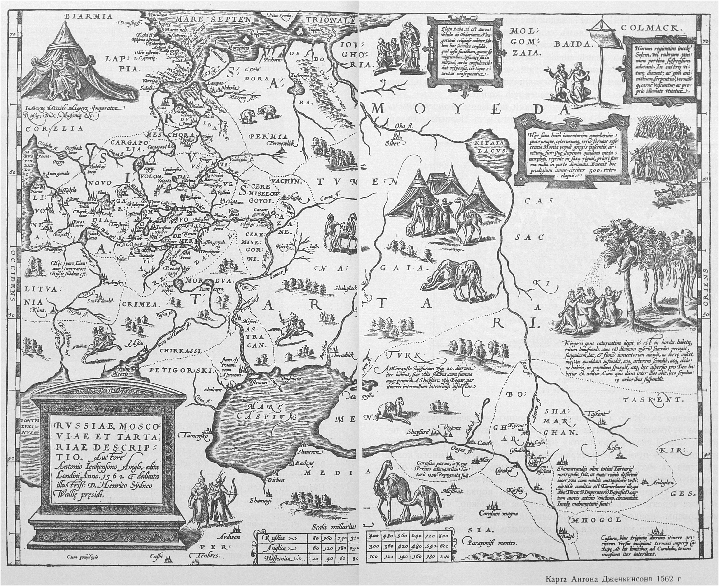 Фрагмент карты России Гесселя Герритса (основанная на чертёже Фёдора Годунова). Кавказ в XV—XVI вв. Сунженский острог (Zunsa).