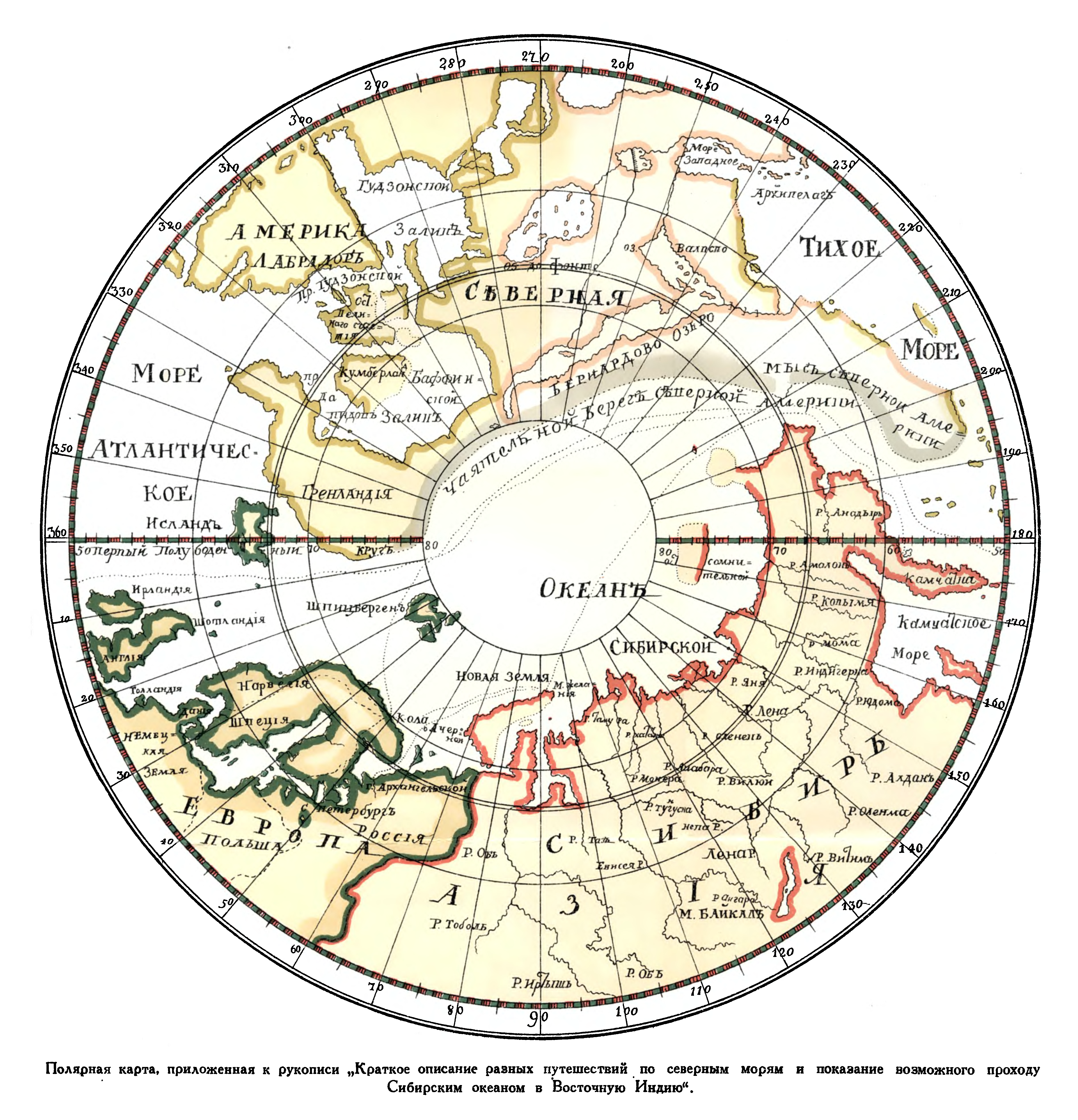 Полярная карта, приложенная к рукописи "Краткое описание разных путешествий по северным морям и показание возможного прохода Сибирским океаном в Восточную Индию"