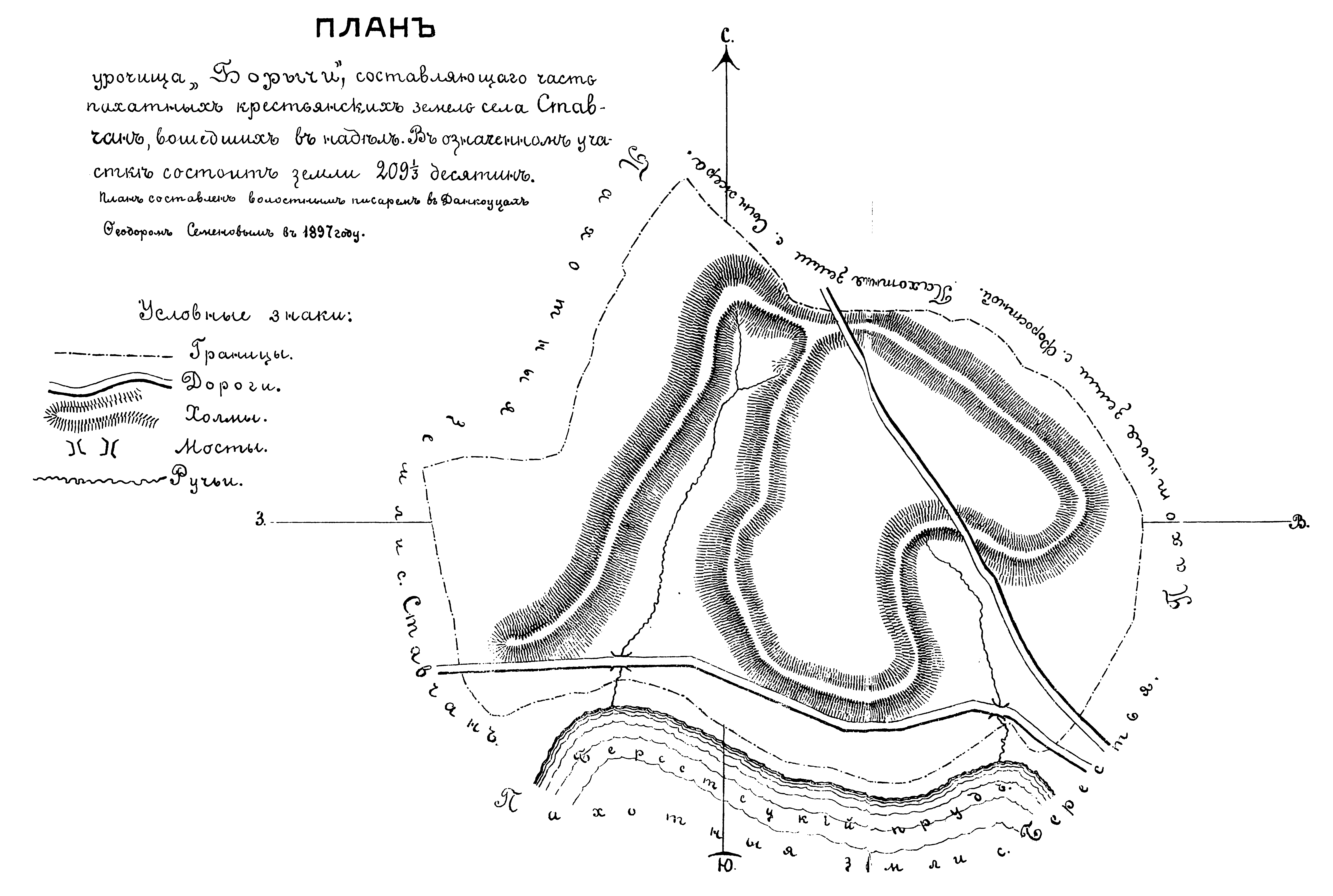 План урочища Борычи, составляющего часть пахотных крестьянских земель села Ставчан, вошедших в надел. В означенном участке состоит земли 209 1/3 десяти