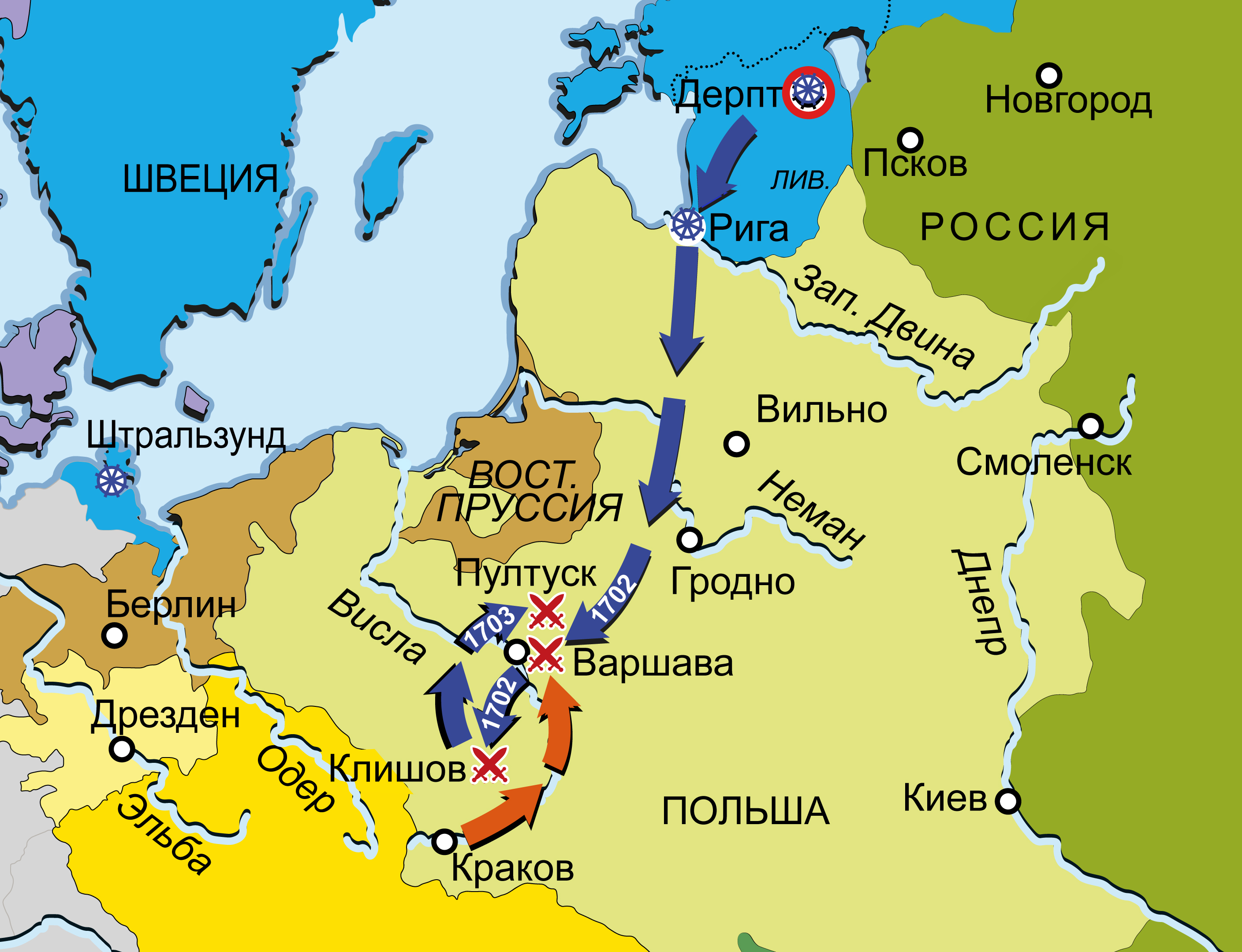 Северная война 1700-1721. Карта кампаний 1701–1704 гг. Действия в Лифляндии и Польше