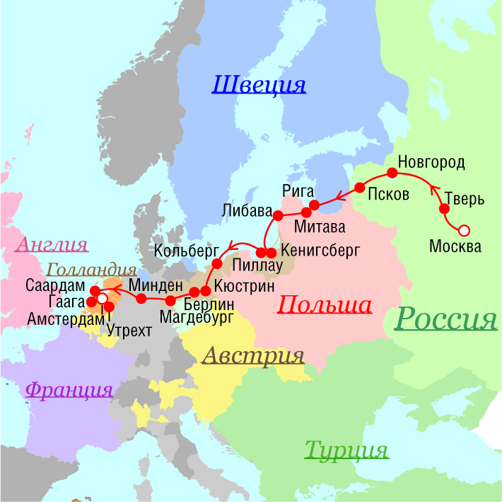Маршрут поездок Петра I - 1699 г.