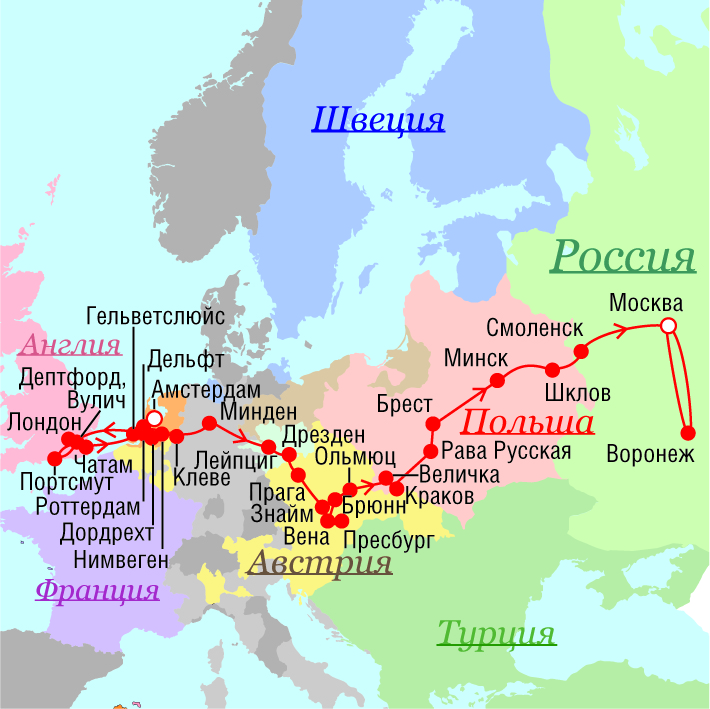 На карте указаны маршруты путешествий Петра I на каждый год. Расстояния приблизительно вычислены по российским дорожникам XVIII и XIX вв. Различия в длине маршрутов Петра и современного пути объясняются другой сеткой дорог. Длина маршрутов, на которые данные дорожников отсутствуют, была определена по электронным картам.