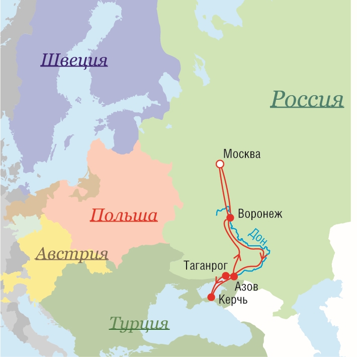 На карте указаны маршруты путешествий Петра I на каждый год. Расстояния приблизительно вычислены по российским дорожникам XVIII и XIX вв. Различия в длине маршрутов Петра и современного пути объясняются другой сеткой дорог. Длина маршрутов, на которые данные дорожников отсутствуют, была определена по электронным картам.