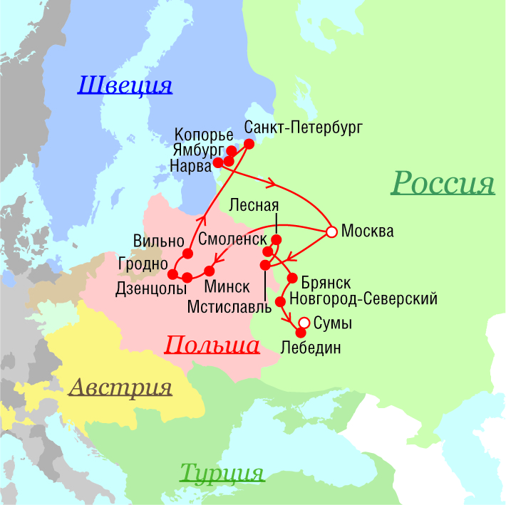 На карте указаны маршруты путешествий Петра I на каждый год. Расстояния приблизительно вычислены по российским дорожникам XVIII и XIX вв. Различия в длине маршрутов Петра и современного пути объясняются другой сеткой дорог. Длина маршрутов, на которые данные дорожников отсутствуют, была определена по электронным картам.