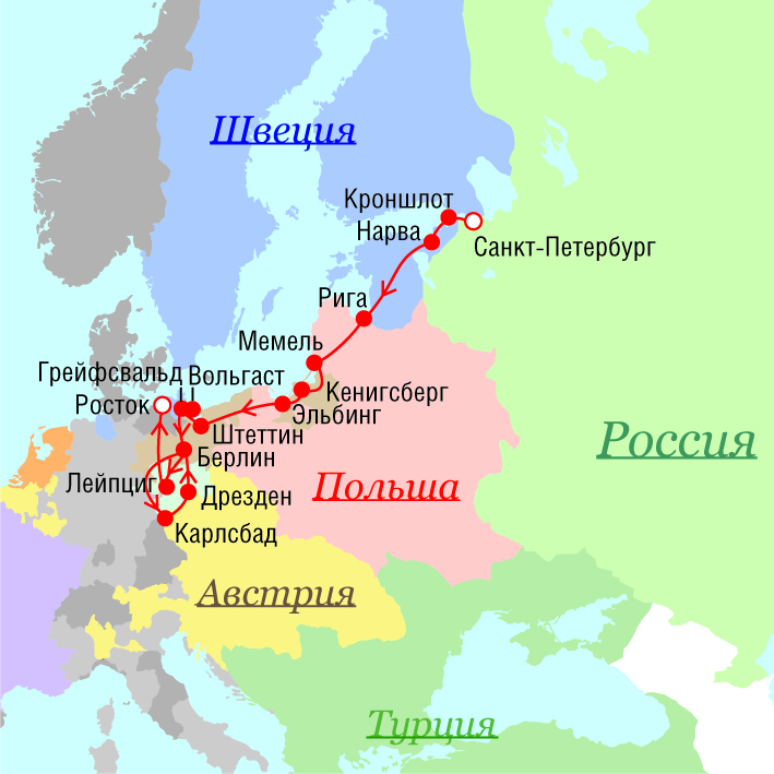Маршрут поездок Петра I - 1712 г.