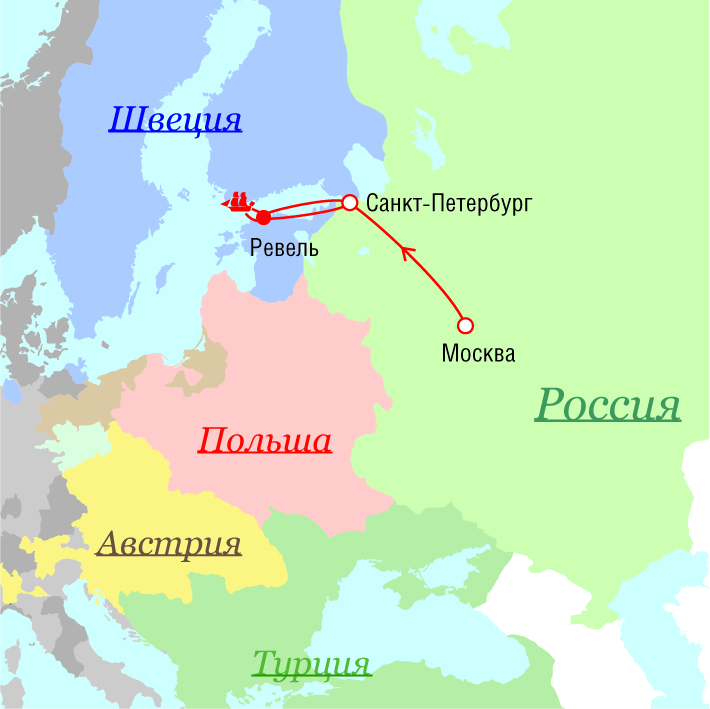 На карте указаны маршруты путешествий Петра I на каждый год. Расстояния приблизительно вычислены по российским дорожникам XVIII и XIX вв. Различия в длине маршрутов Петра и современного пути объясняются другой сеткой дорог. Длина маршрутов, на которые данные дорожников отсутствуют, была определена по электронным картам.