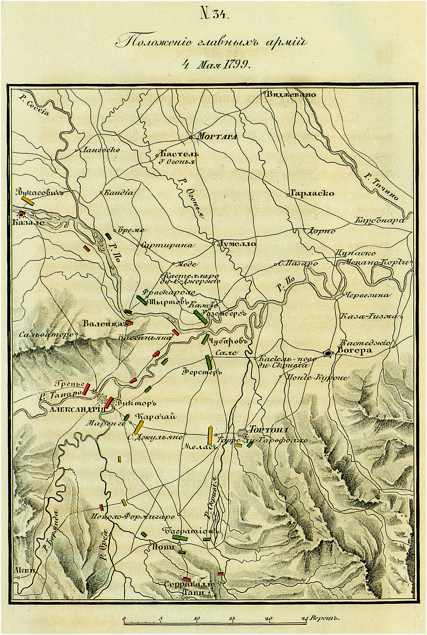 Карта: Положение главных армий 4 (15) мая 1799 г. Накануне Первого сражения у Маренго 5 (16) мая 1799 г.