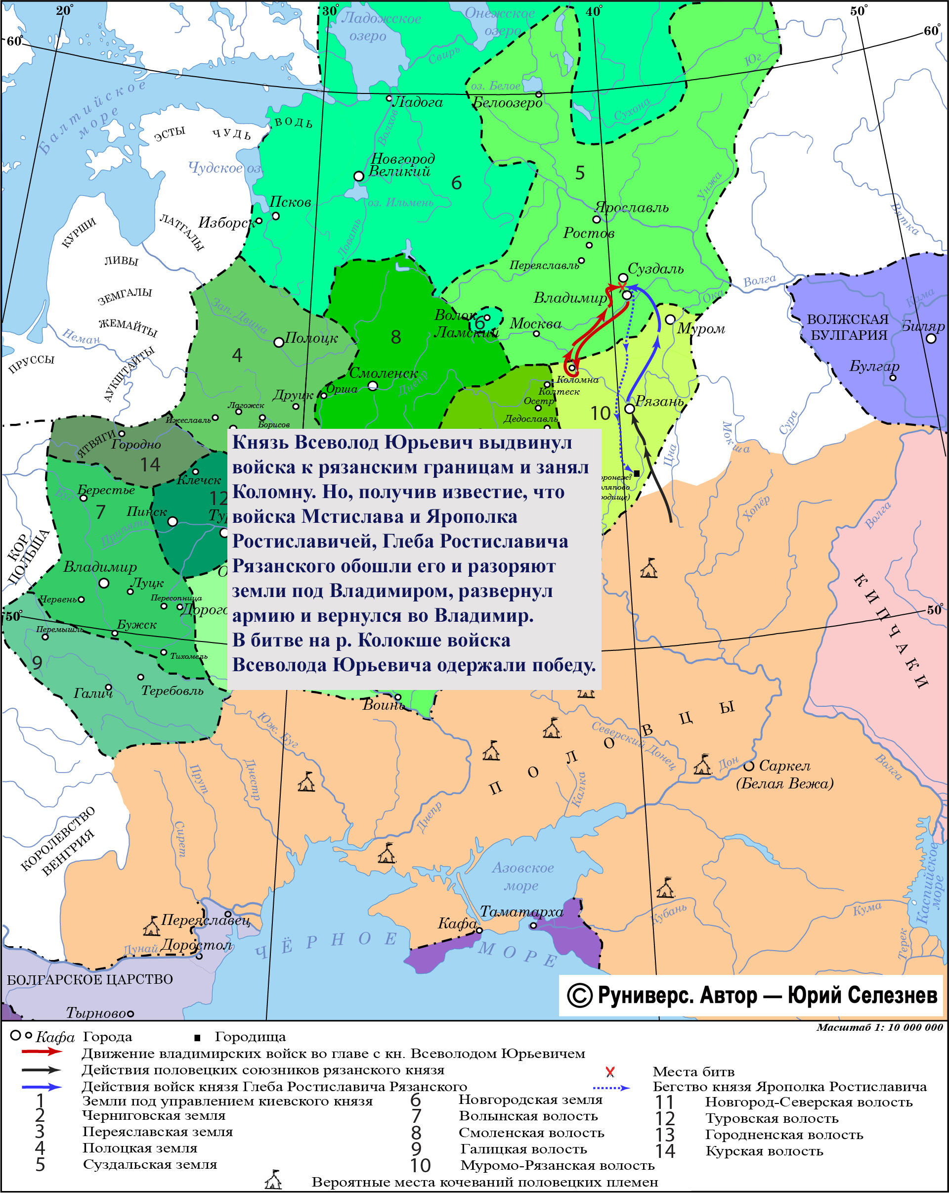 Продолжение усобицы Ростиславичей и Юрьевичей. Князь Всеволод Юрьевич выдвинул войска к рязанским границам и занял Коломну. Однако здесь он получил известие, что войска его племянников — Мстислава и Ярополка Ростиславичей, а также князя Глеба Ростиславича Рязанского, поддержанные половецкими отрядами, обошли силы суздальской земли и разоряют территории под Владимиром. Всеволод Юрьевич развернул армию и спешно вернулся к столице своего княжества. На р. Колокше произошло решающее столкновение, в ходе которого войска князя Всеволода Юрьевич одержали победу.