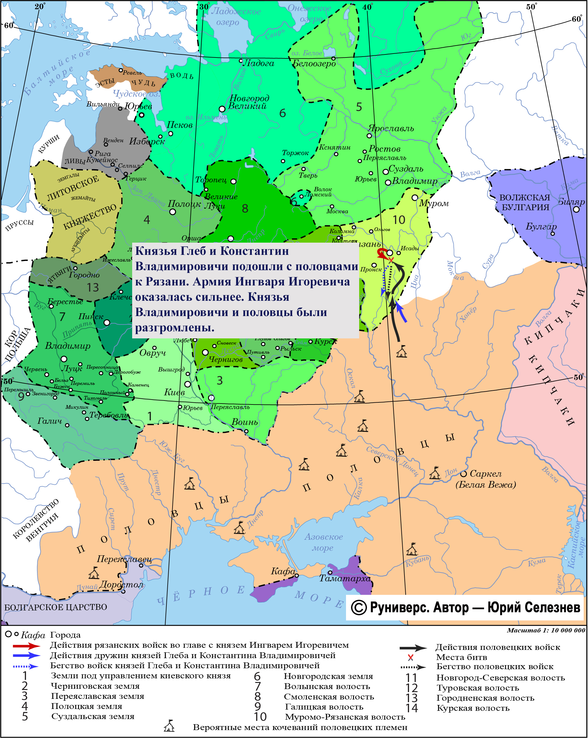 Князья Глеб и Константин Владимировичи подошли с половцами к Рязани. Армия Ингваря Игоревича оказалась сильнее. Князья Владимировичи и половцы были разгромлены.