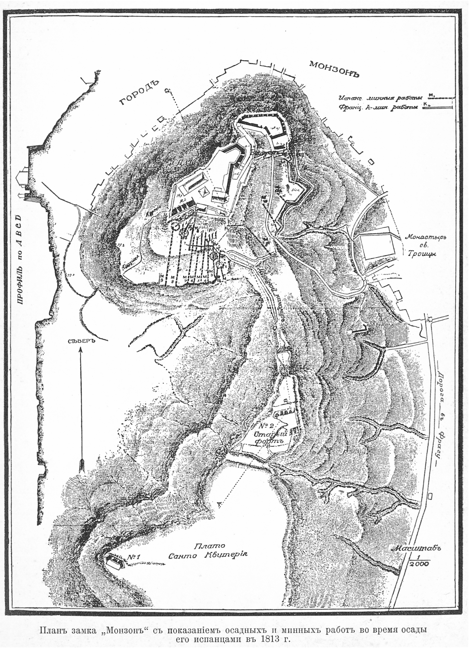 Замок "Монзон" с показанием осадных и минных работ во время осады его испанцами в 1813 году