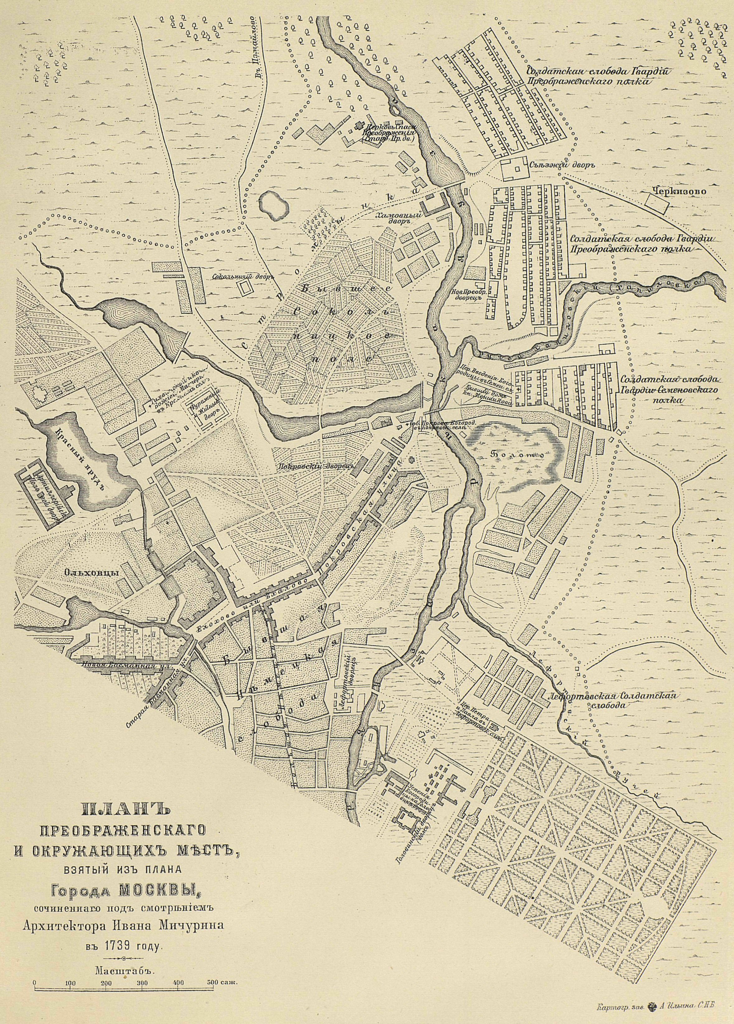 План Преображенского и окружающих его мест, взятый из плана города Москвы, сочиненного под присмотром архитектора Ивана Мичурина в 1739 году
