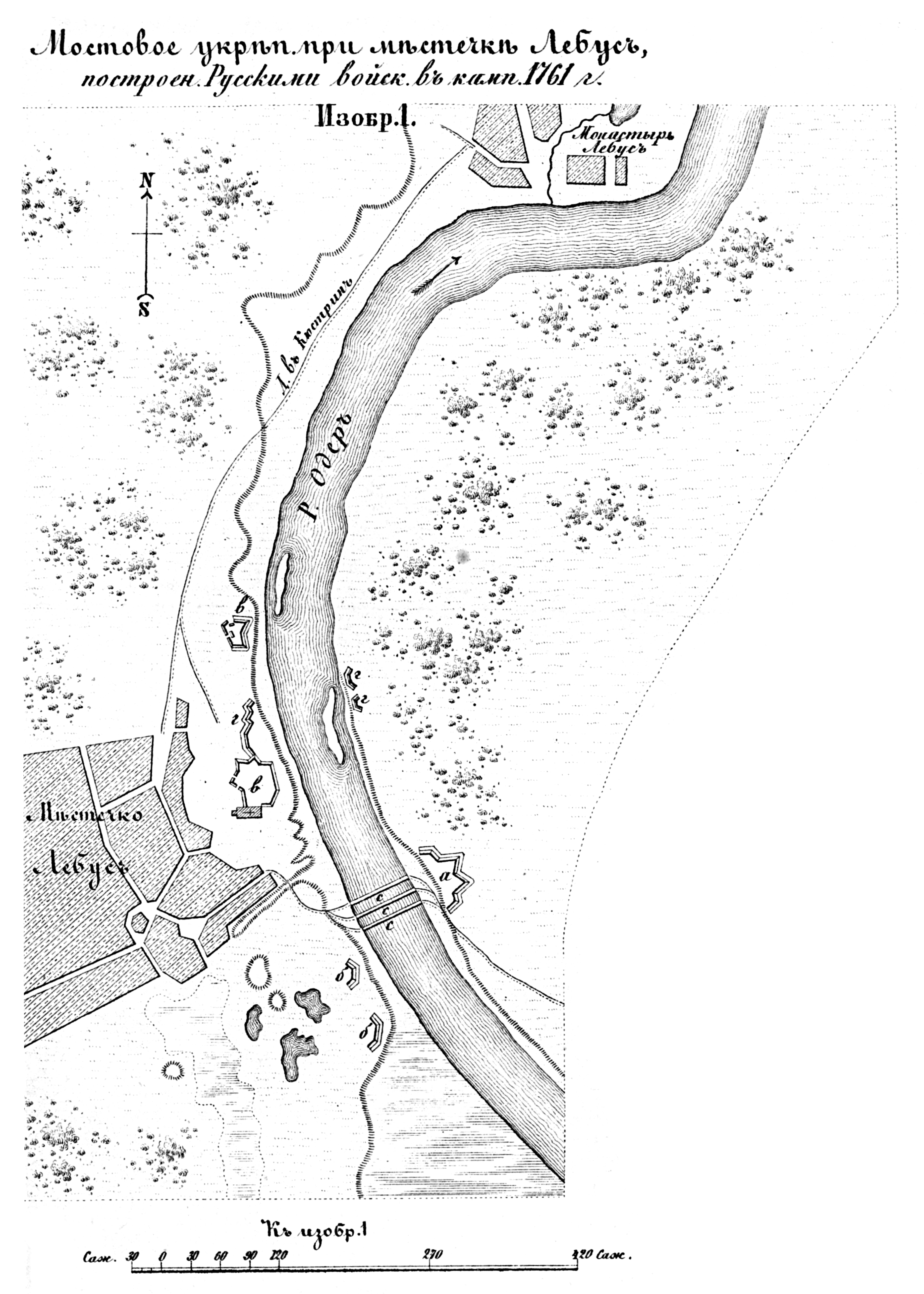Полевые и временные укрепления. Изобр.1. Мостовое укрепление при местечке Лебус, построенное русскими войсками в кампанию 1761 года