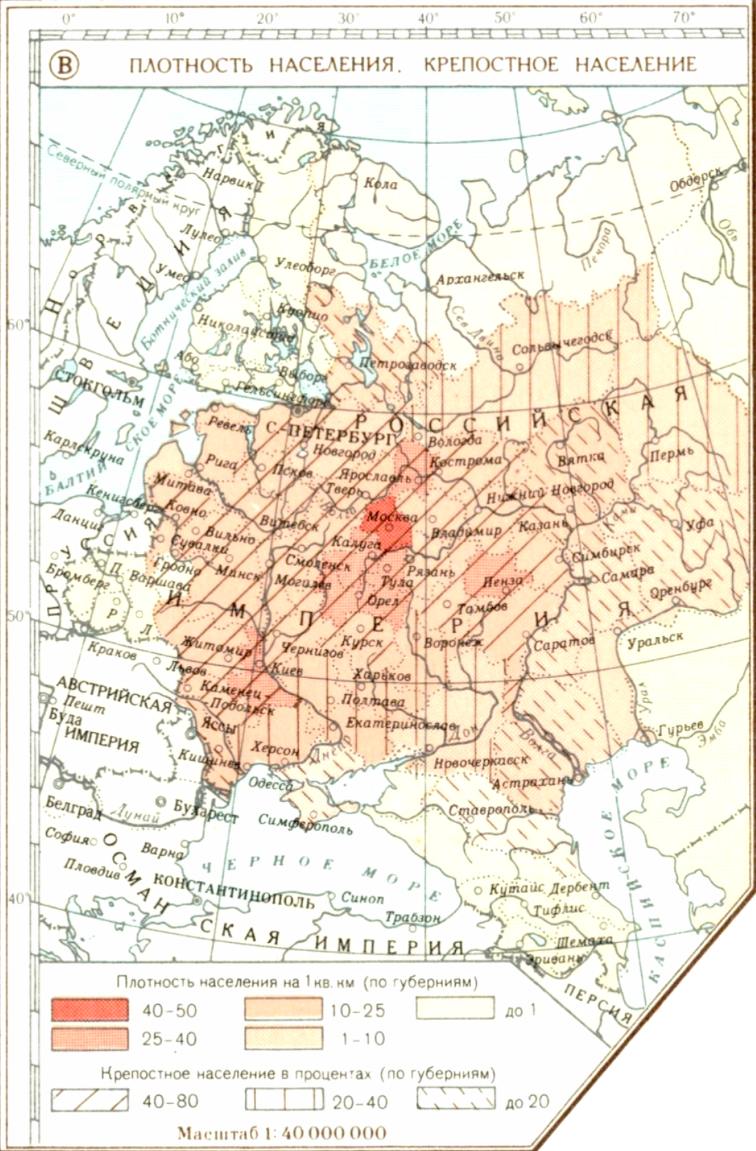 Военно-экономическая карта России накануне Крымской войны 1853-1856 гг. (В) Плотность населения. Крепостное население.