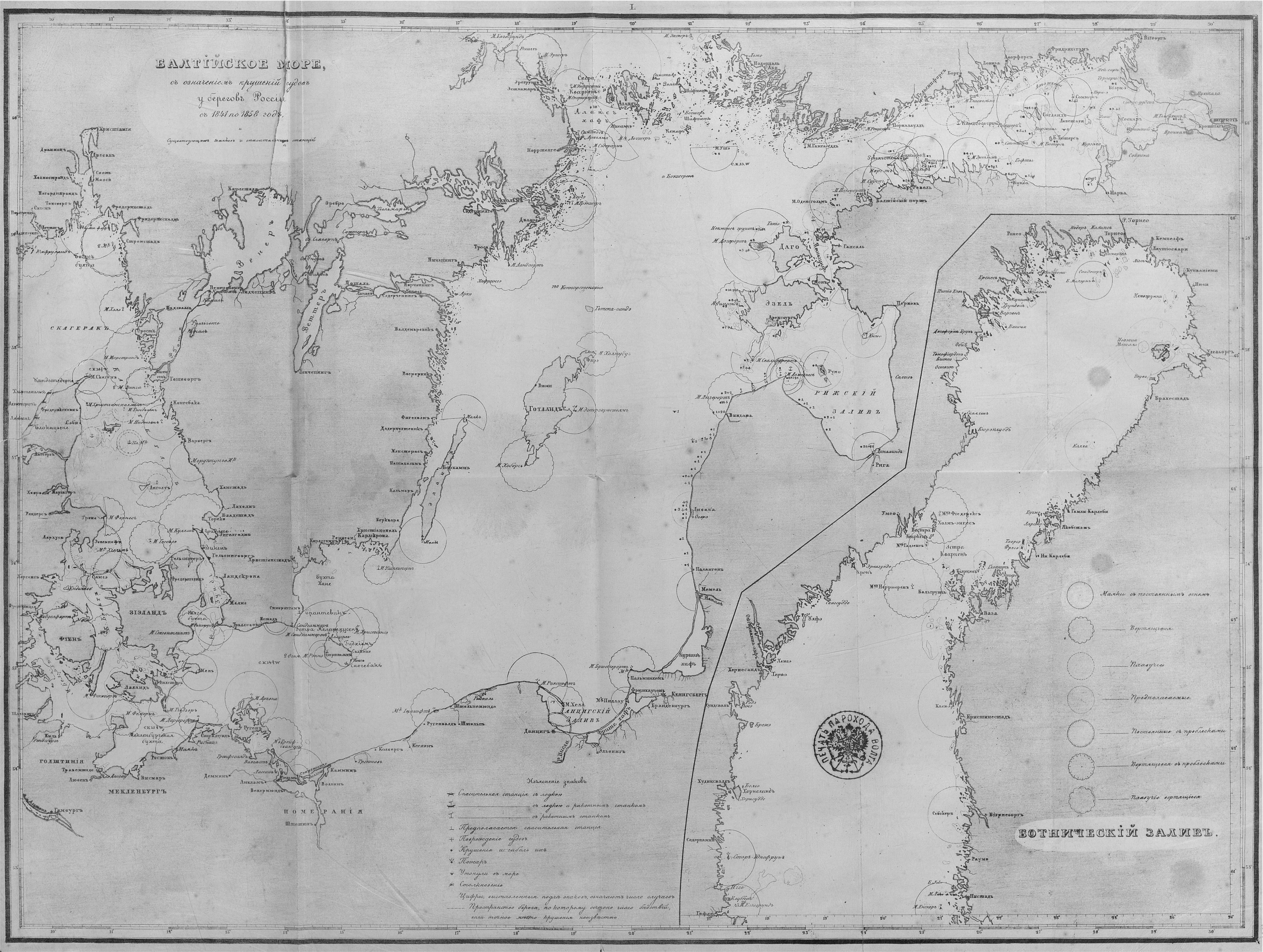 Балтийское море с означением крушений судов у берегов России с 1841 по 1858 год и существующие маяки и спасительные станции.