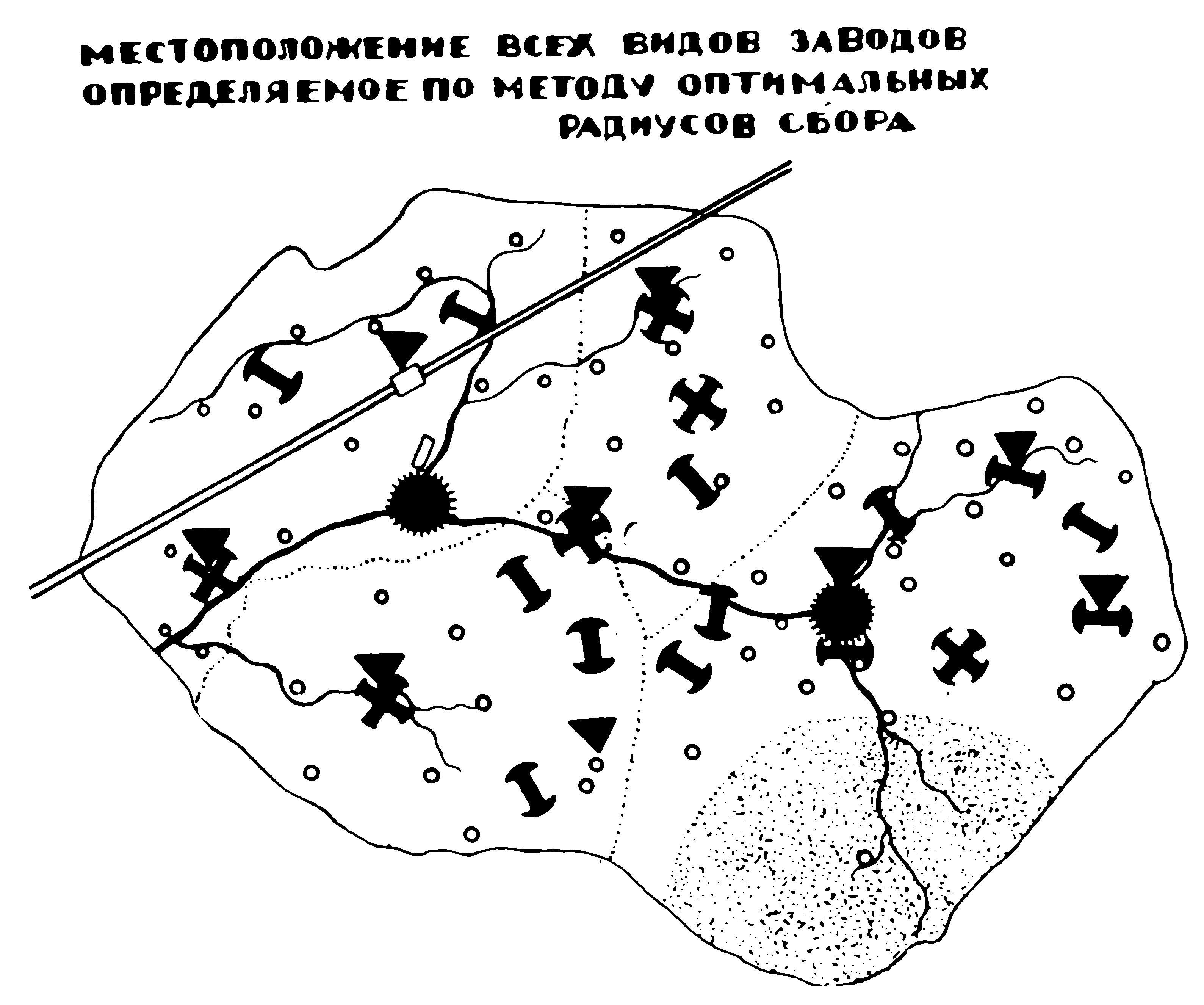 Местоположение всех видов заводов, определяемое по методу оптимальных радиусов сбора
