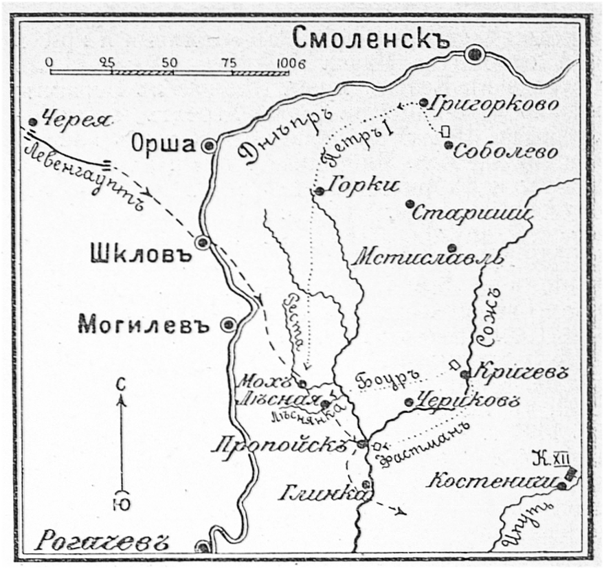 Район сражения 28 сентября 1708 года у деревни Лесная между русскими и шведскими войсками