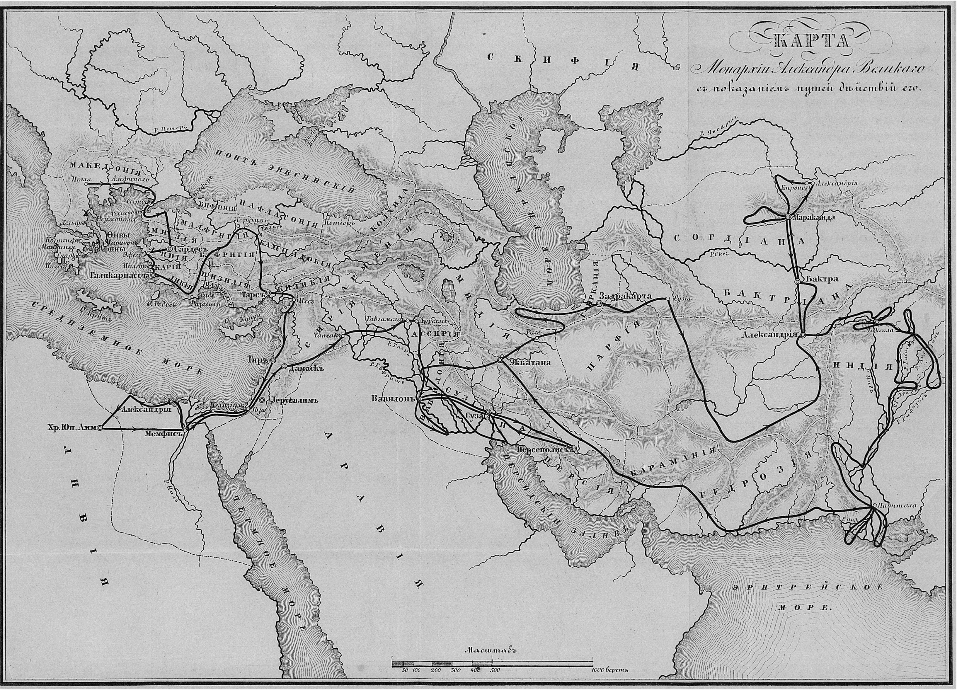 Карта Монархии Александра Великого с показанием путей действий его.