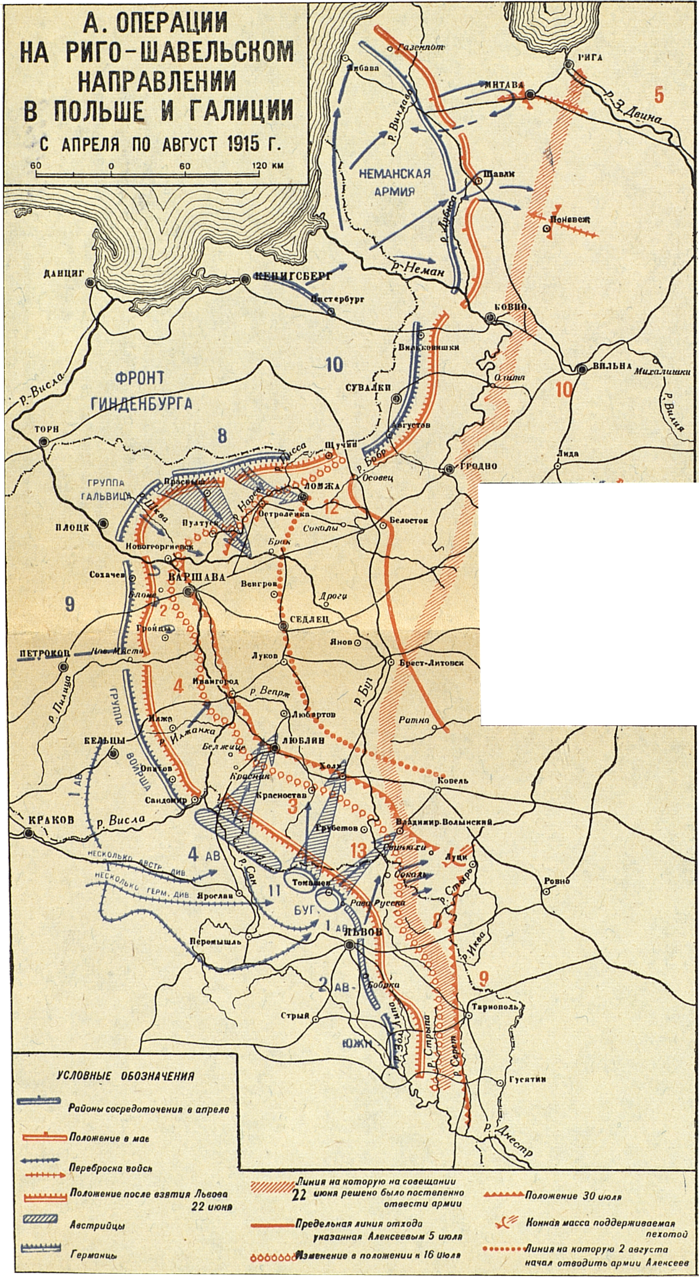 Кампания 1915 года. Русский театр. Отход русских армий. А.Операция на Риго-Шавельском направлении, в Польше и Галиции (период с апреля по август).