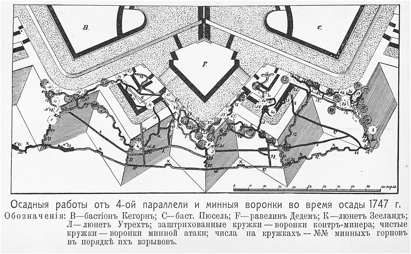 Осадные работы от 4-ой параллели и минные воронки во время осады 1747 года