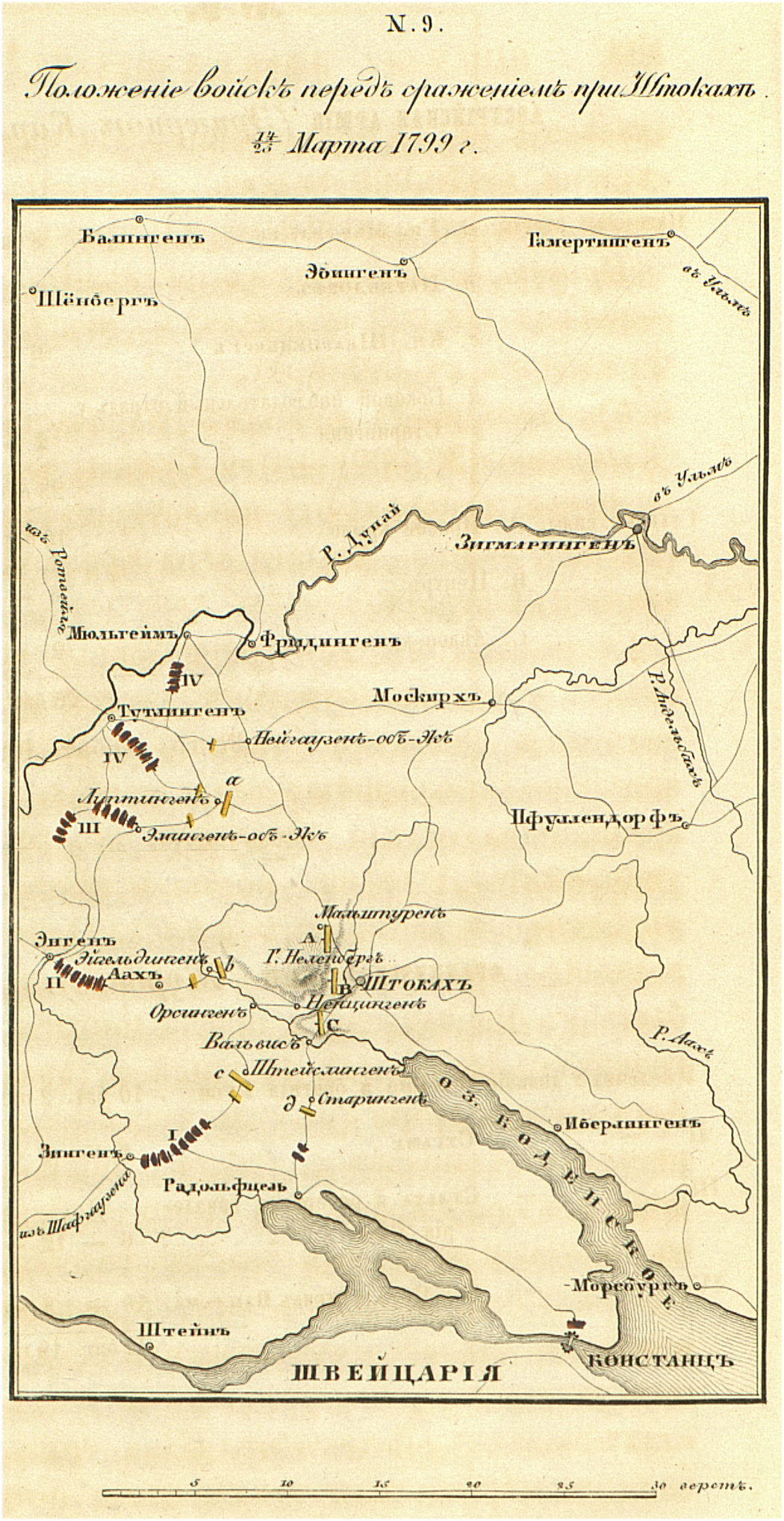Положение войск перед сражением при Штоках, 14 марта 1799 года.
