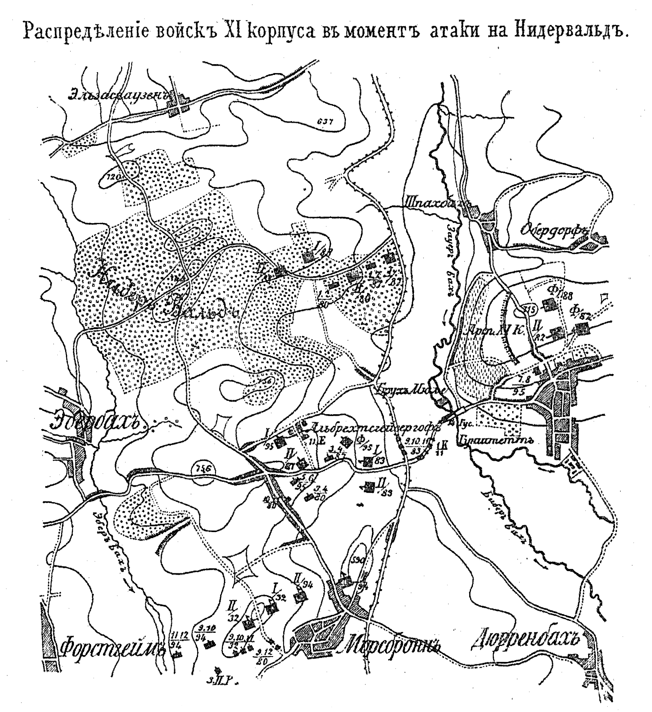 Распределение войск XI корпуса в момент атаки на Нидервальд